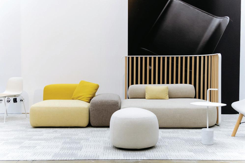 Sustainability was a major theme and a recurring topic among designers and exhibitors alike. Style Garage’s booth brought the concept front and centre, with a tomato-coloured velour sofa whose fabric and stuffing were made from recycled water bottles, nestled in a kind of glass and steel “conservatory” lined with potted plants. The entire booth, said SG’s Olga Liandenko, was designed to be zero waste.