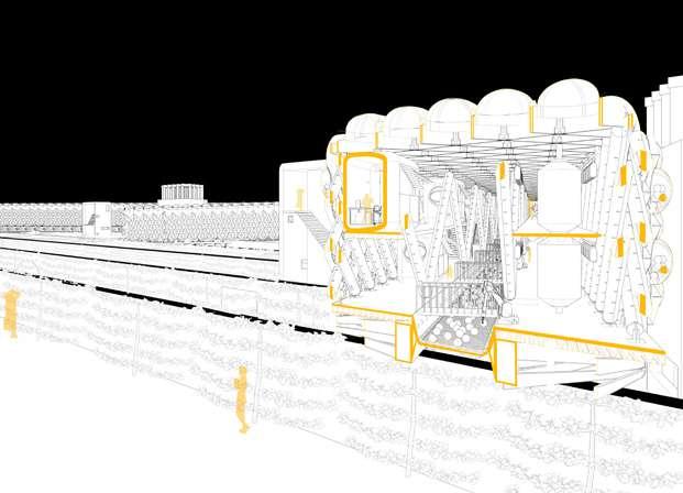 13 Circulationtower forDeliverieswithpulleysystem thethefoodwastebroughinto site MainBuildingrestingon cappingbeamsoftherammed chalkwalls Community Allotments 1 2 3 4 5 6 1 Offices 2ConveyorBeltfor WashingOranges 3 Juice Production and Rainwater Treatment 4 Rainwater Silos 5 Circulation Tower (Public) 6 Circulation Tower and Deliveries(Private)