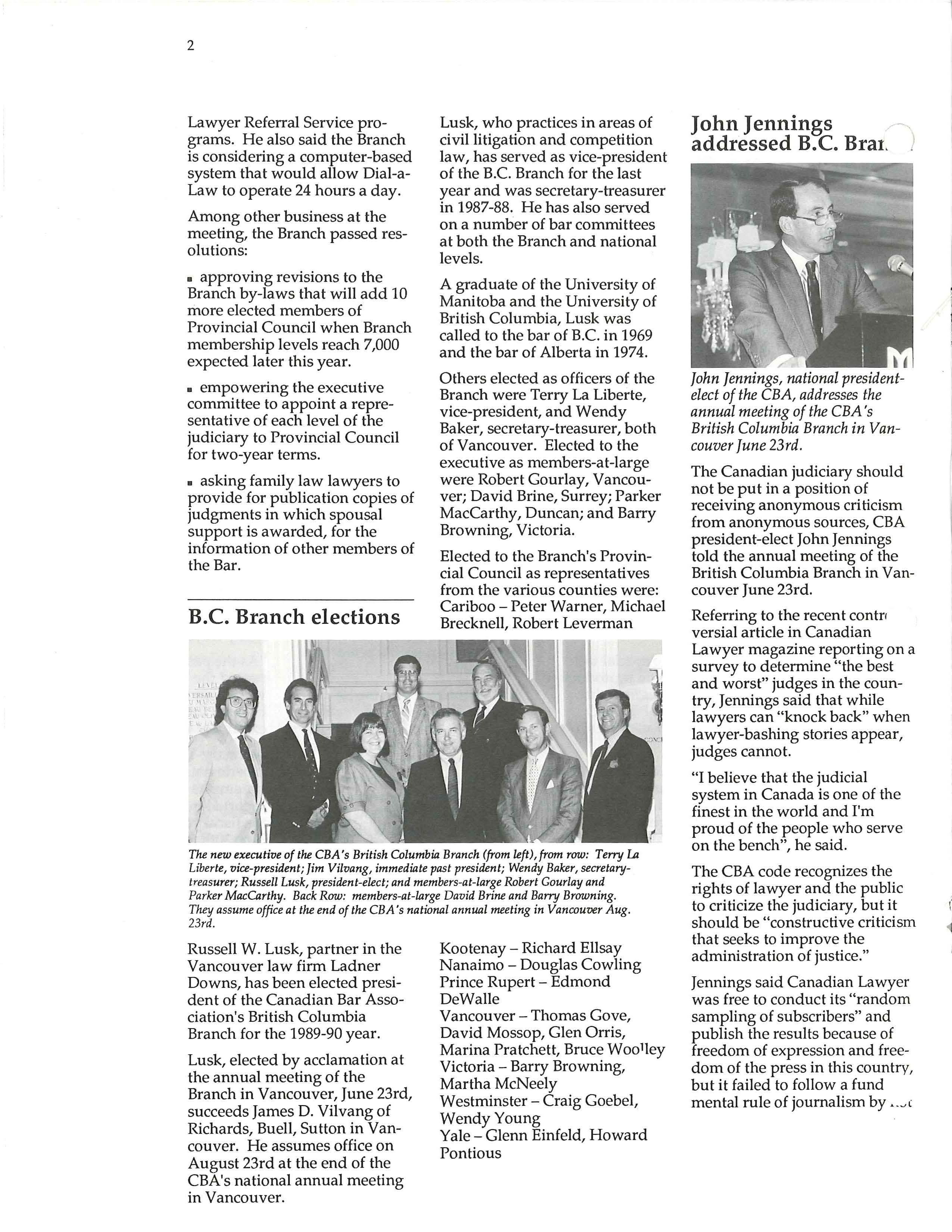 Lusk, who practices in areas of civil litigation and competition law, has served as vice -president of the B.C. Branch for the last year and was secretary- treasurer in 1987-88. He has also served on a number of bar committees at both the Branch and national levels .