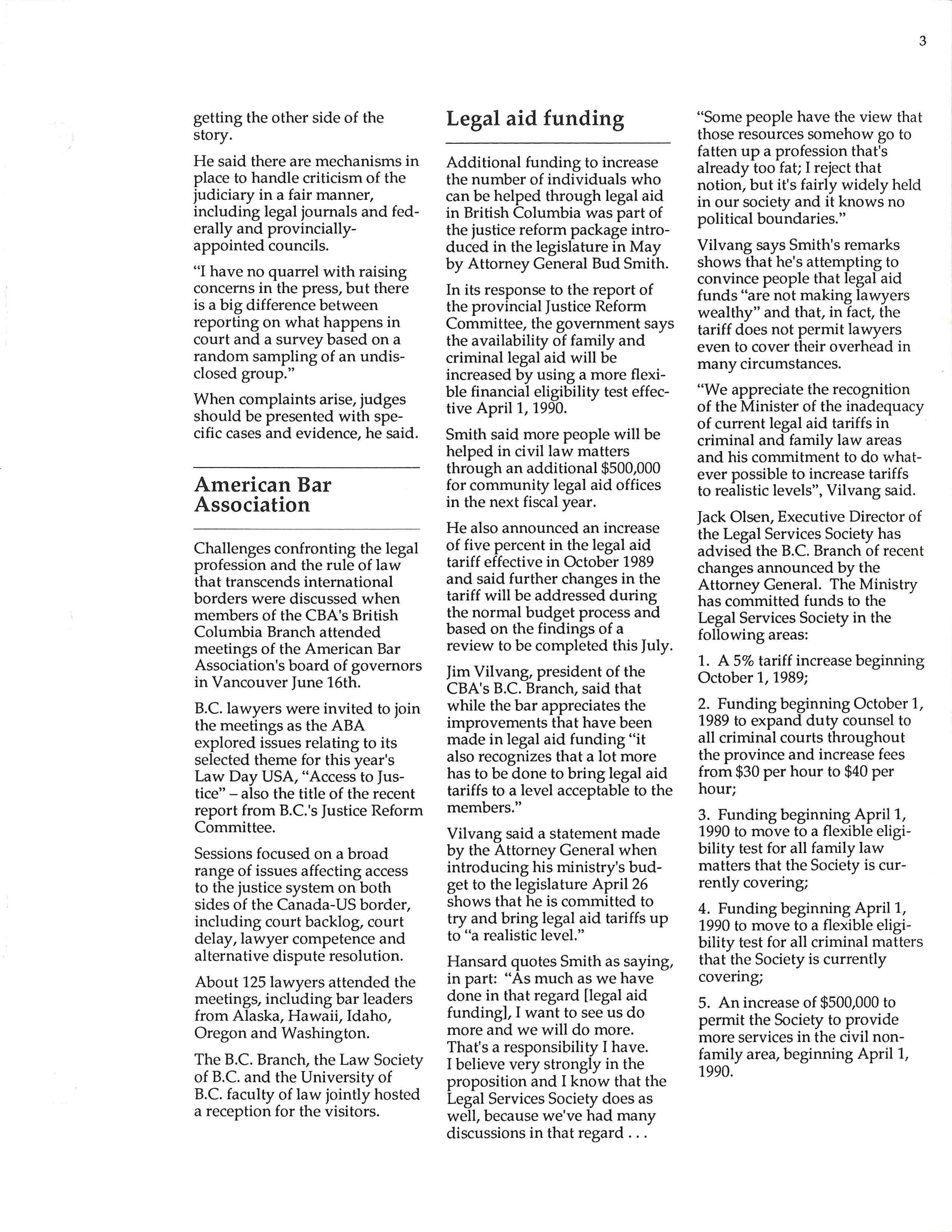Jim Vilvang, president of the CBA's B.C. Branch, said that while the bar appreciates the improvements that have been made in legal aid funding "it also recognizes that a lot more has to be done to bring legal aid tariffs to a level acceptable to the members."