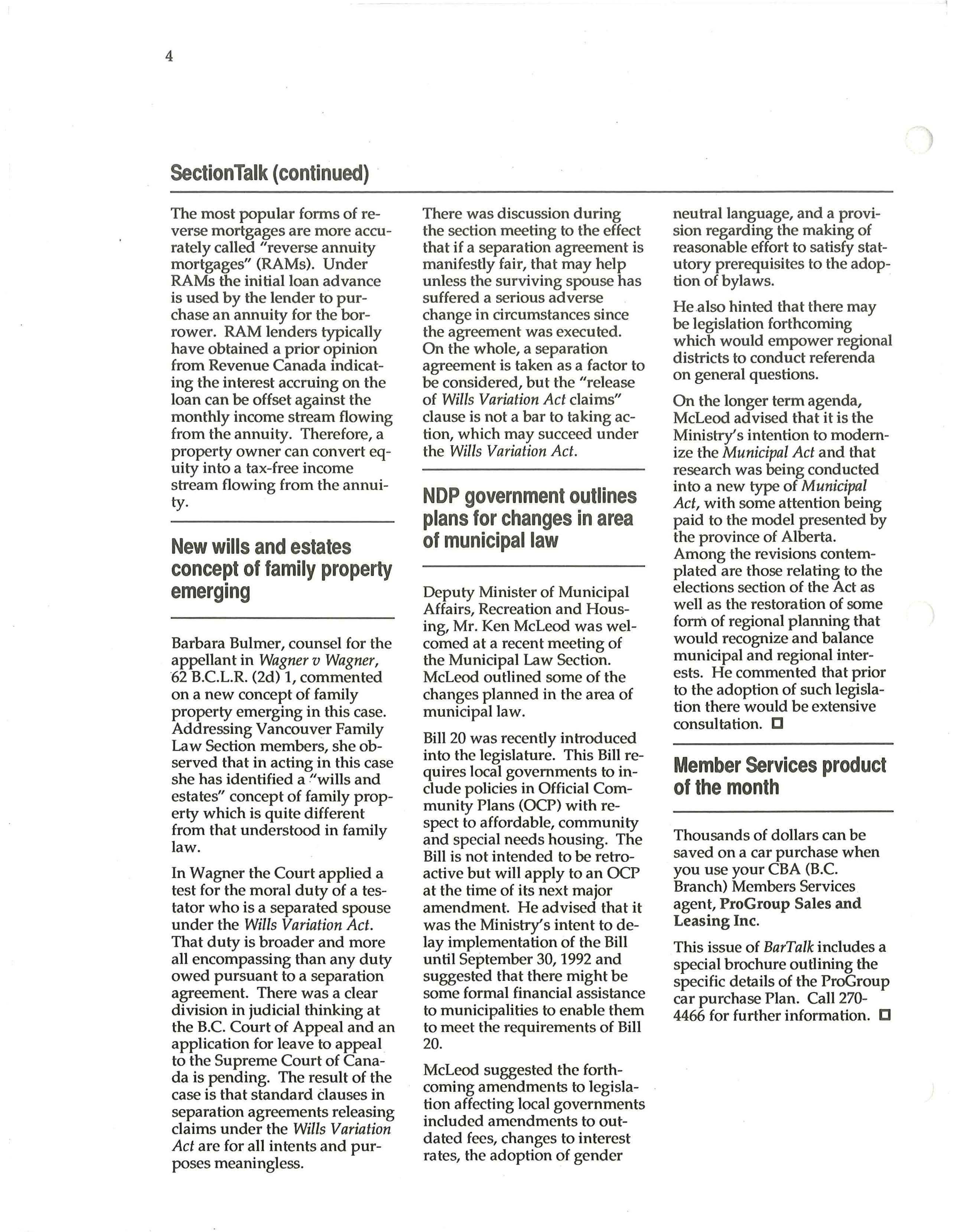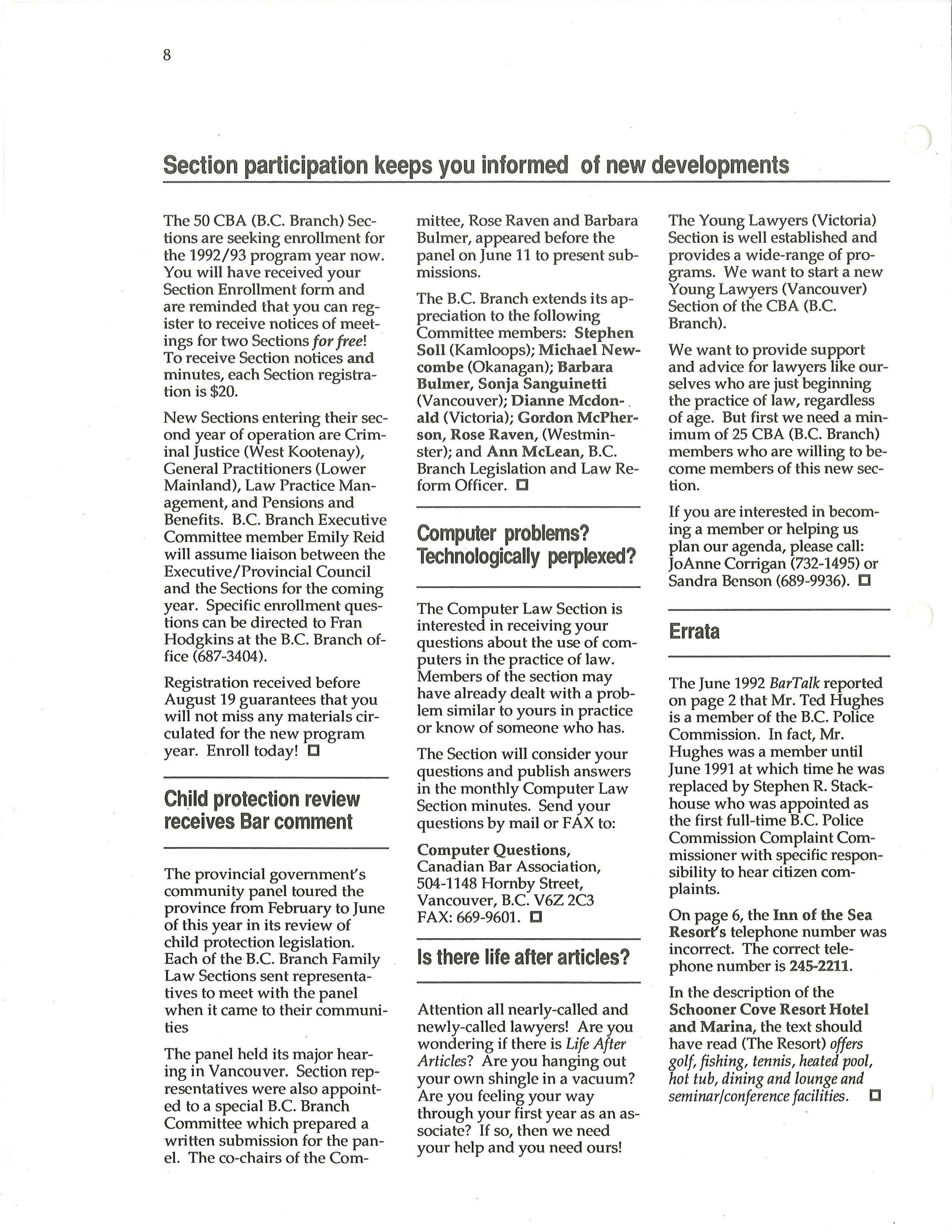The 50 CBA (B.C. Branch) Sections are seeking enrollment for the 1992/93 program year now. You will have received your Section Enrollment form and are reminded that you can register to receive notices of meetings for two Sections for free! To receive Section notices and minutes, each Section registration is $20.