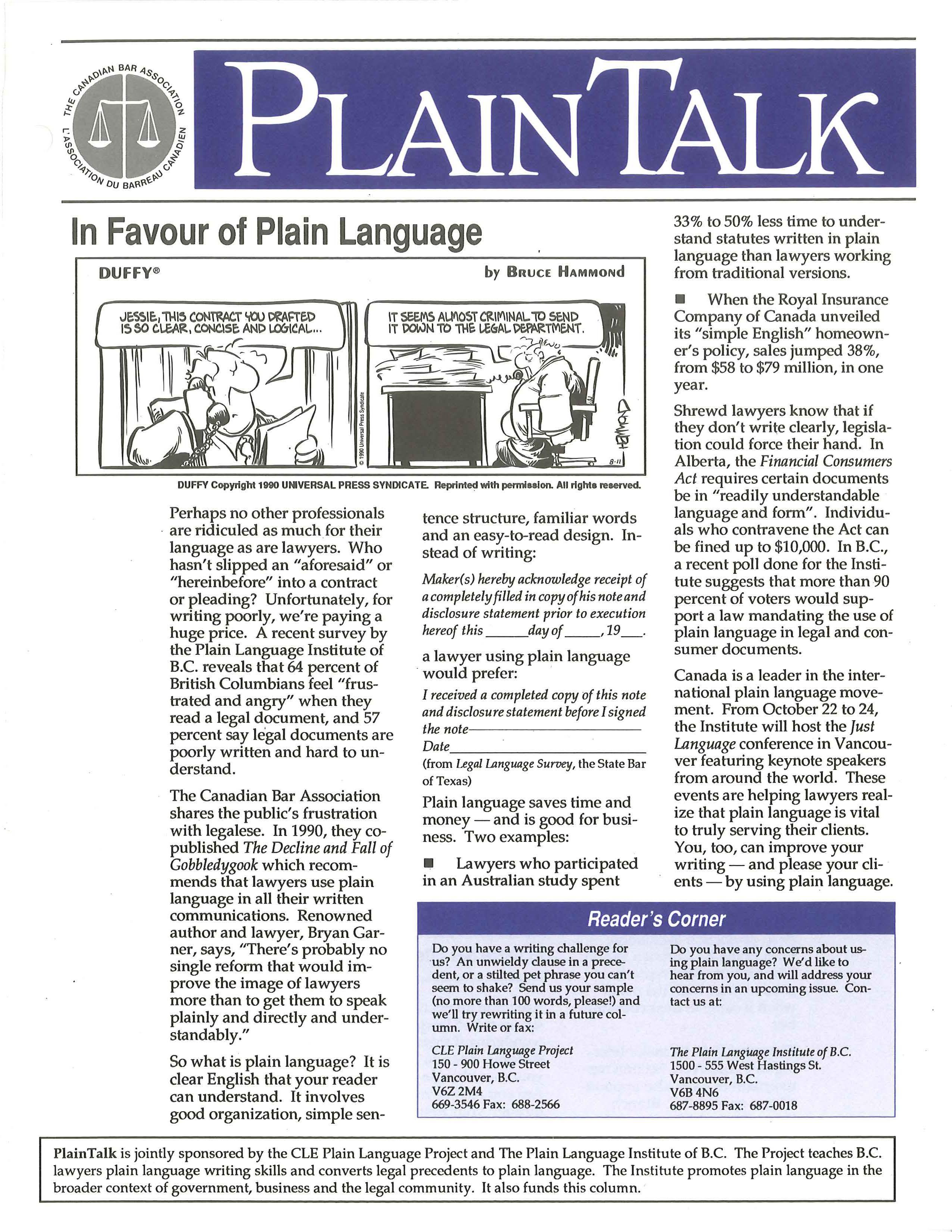 Plain Talk is jointly sponsored by the CLE Plain Language Project and The Plain Language Institute of B.C. The Project teaches B.C. lawyers plain language writing skills and converts legal precedents to plain language. The Institute promotes plain language in the broader context of government, business and the legal community. It also funds this column.
