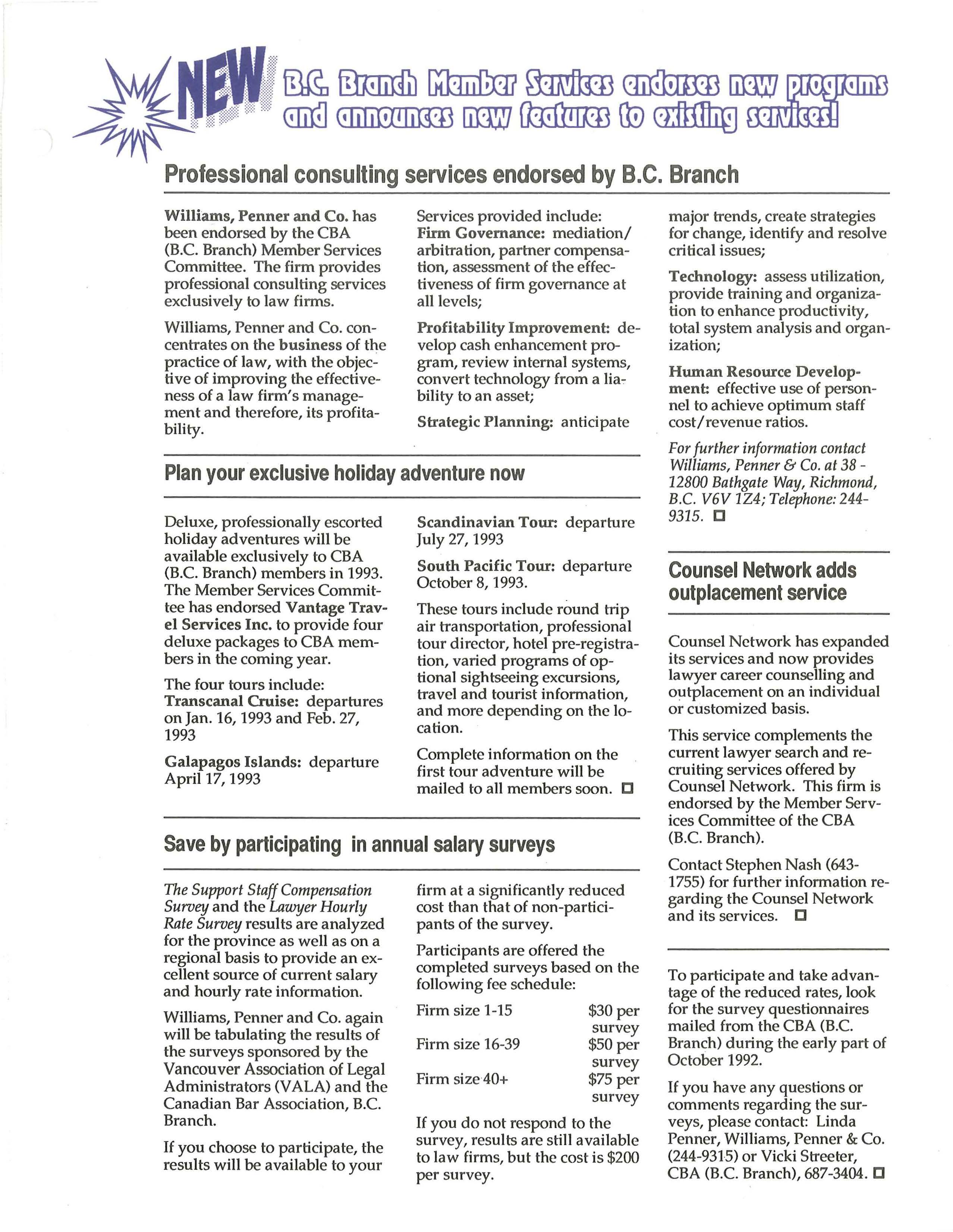 Williams, Penner and Co. has been endorsed by the CBA (B.C. Branch) Member Services Committee. The firm provides professional consulting services exclusively to law firms.