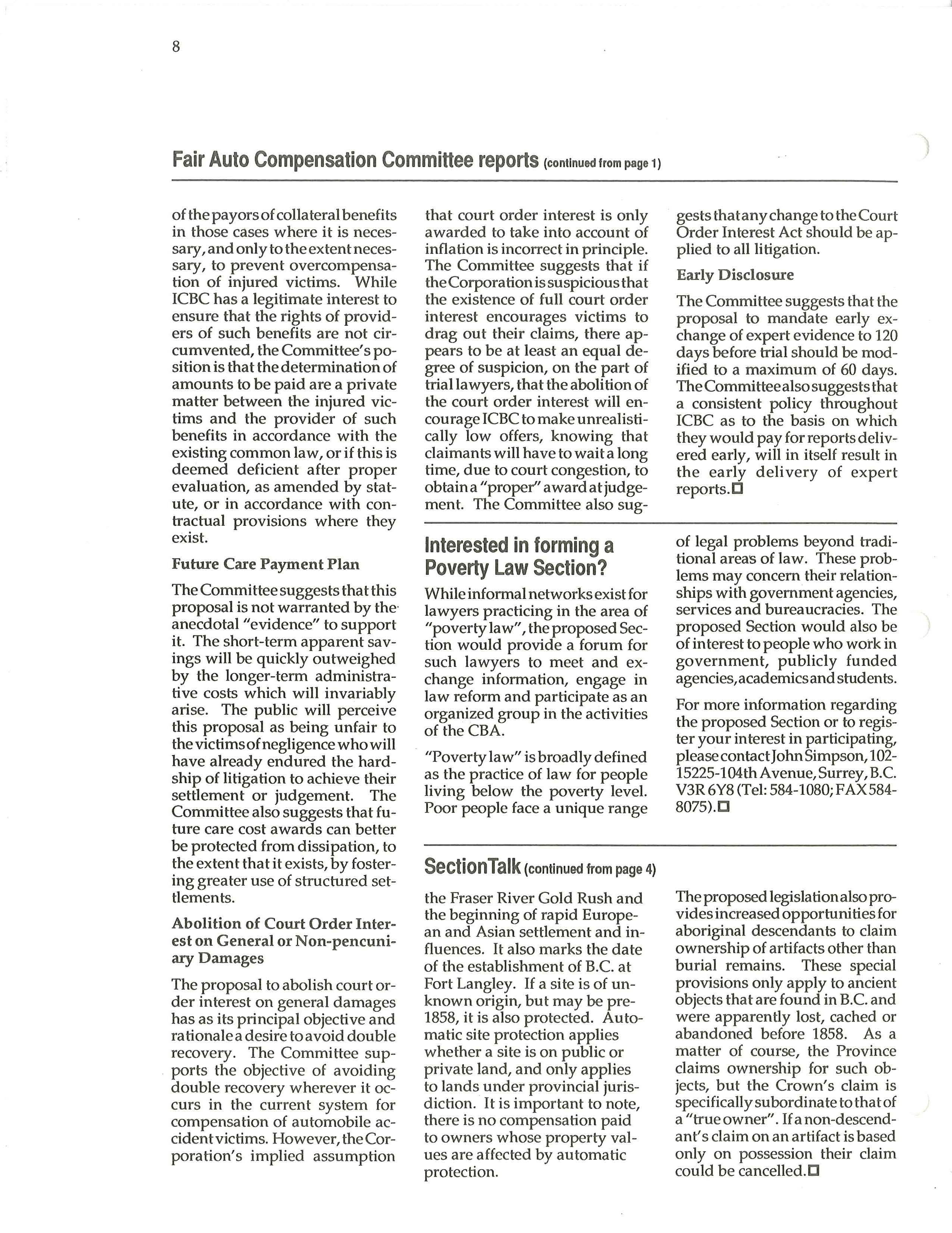 Initiatives that have the goal to eliminate overcompensation of persons injured through the fault of others, whether it be in motor vehicle or otherwise, is supported by the Committee. However, it is the Committee's opinion that the legislative proposal put forward by ICBC will not save money for the Corporation. Rather, it will result in the reimbursement Please turn to page 8