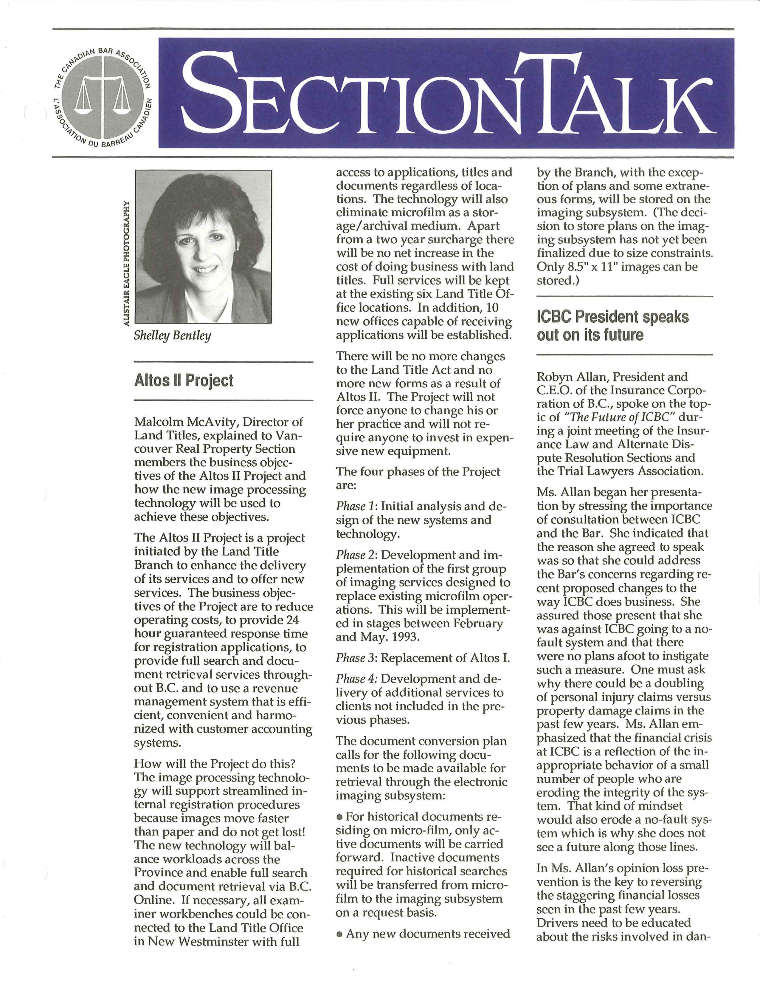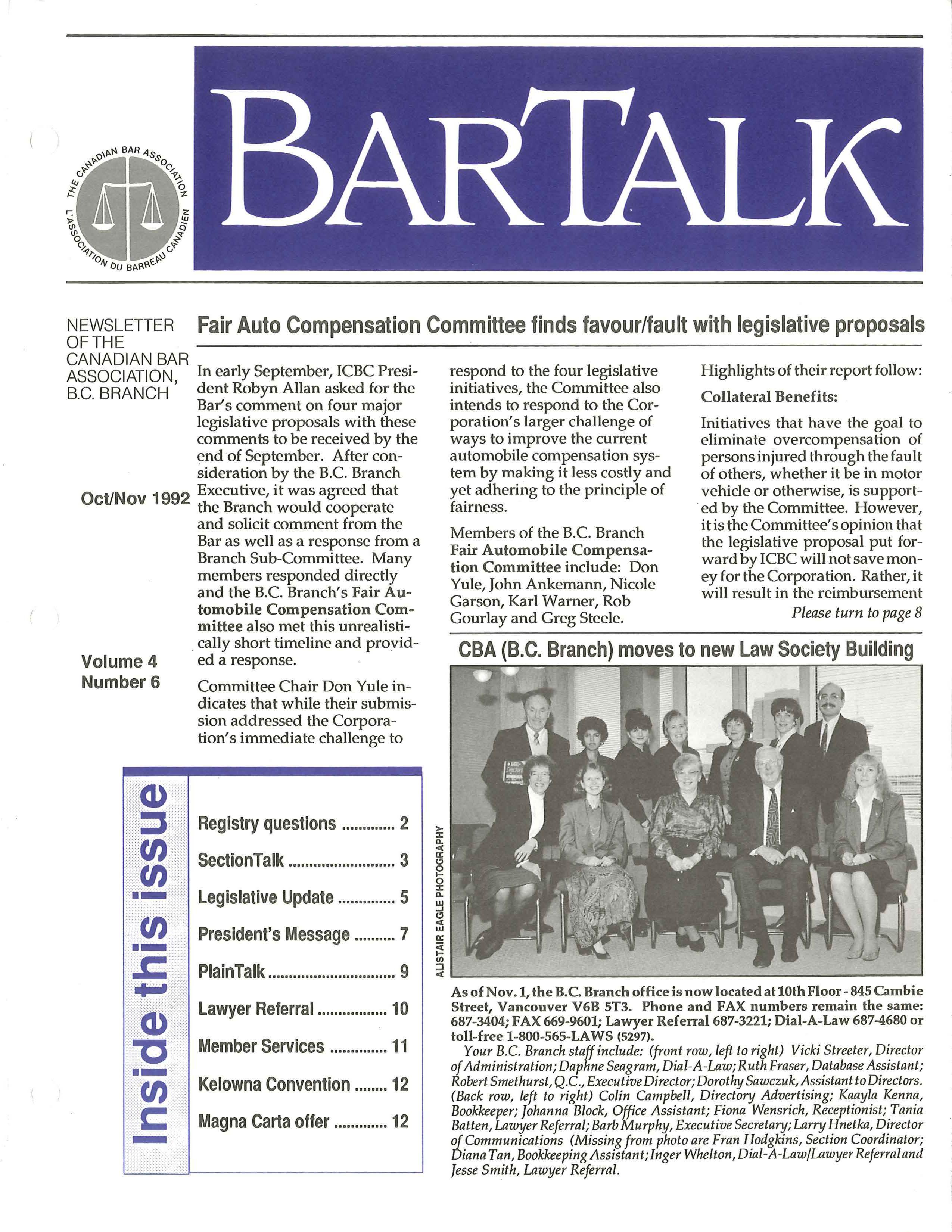 BarTalk is published by the British Columbia Branch of the Canadian Bar Association, 10th Floor - 845 Cambie St. Vancouver, B.C. V6B ST3 Telephone: (604) 687-3404 FAX: 669-9601