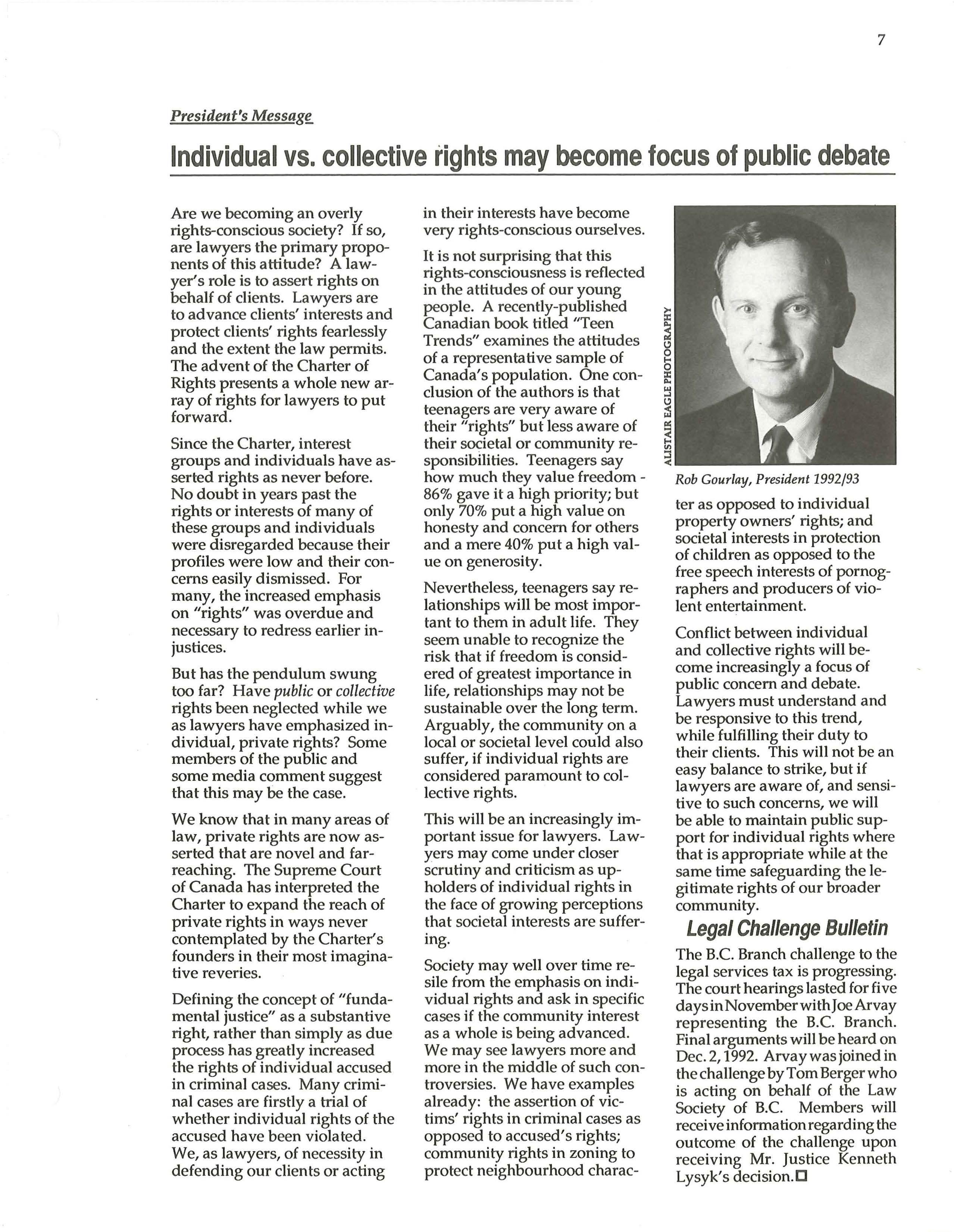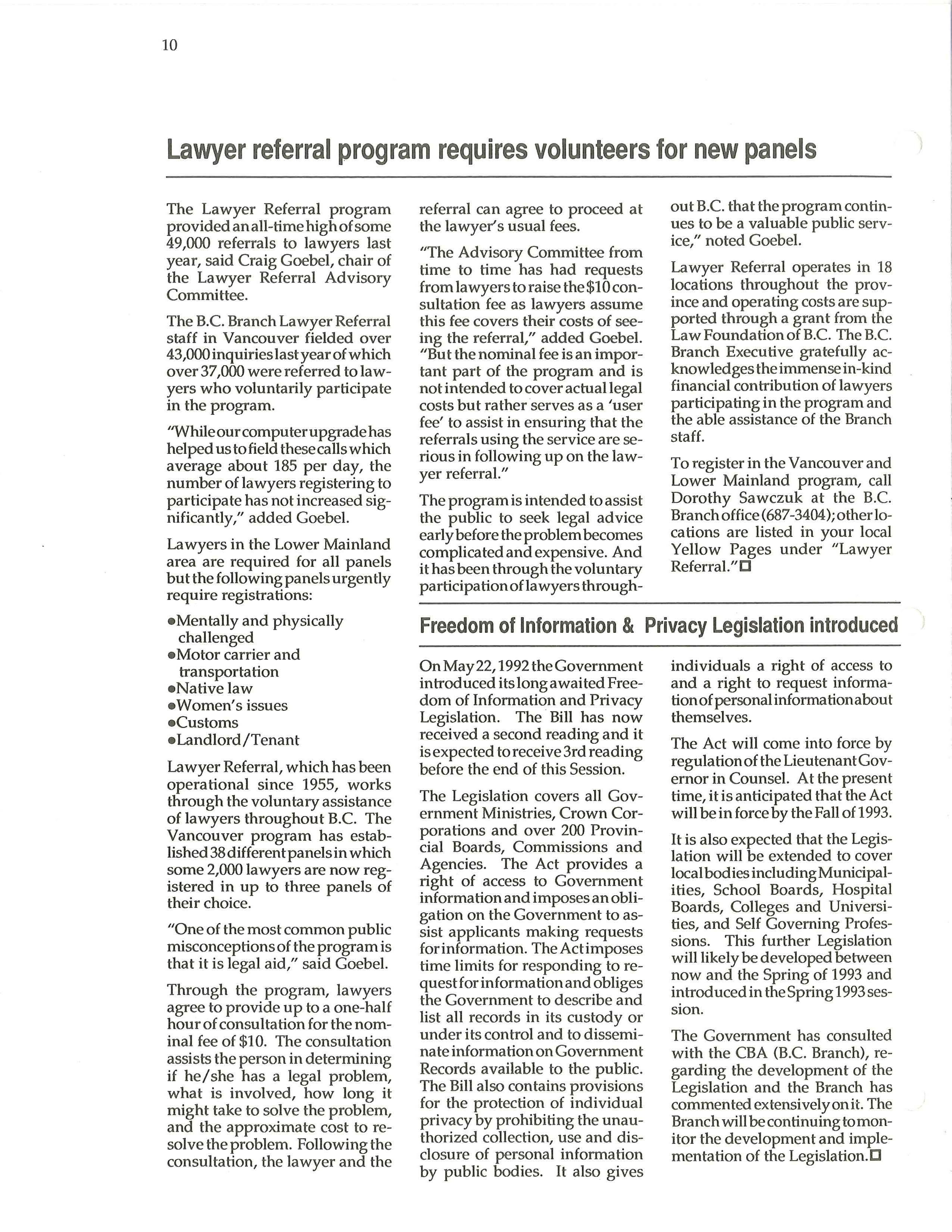 For over twenty years the CBA (B.C. Br anch) Member Services Committee has endeavoured to do three things: to provide useful programs, services and p r oducts to lawyers and their firms; to provide revenue to the B.C. Branch and to serve the public interest. In serving the public inte r est, the Lawyer Referral and Dial-A-Law programs have been well received by the people of British Columbia.