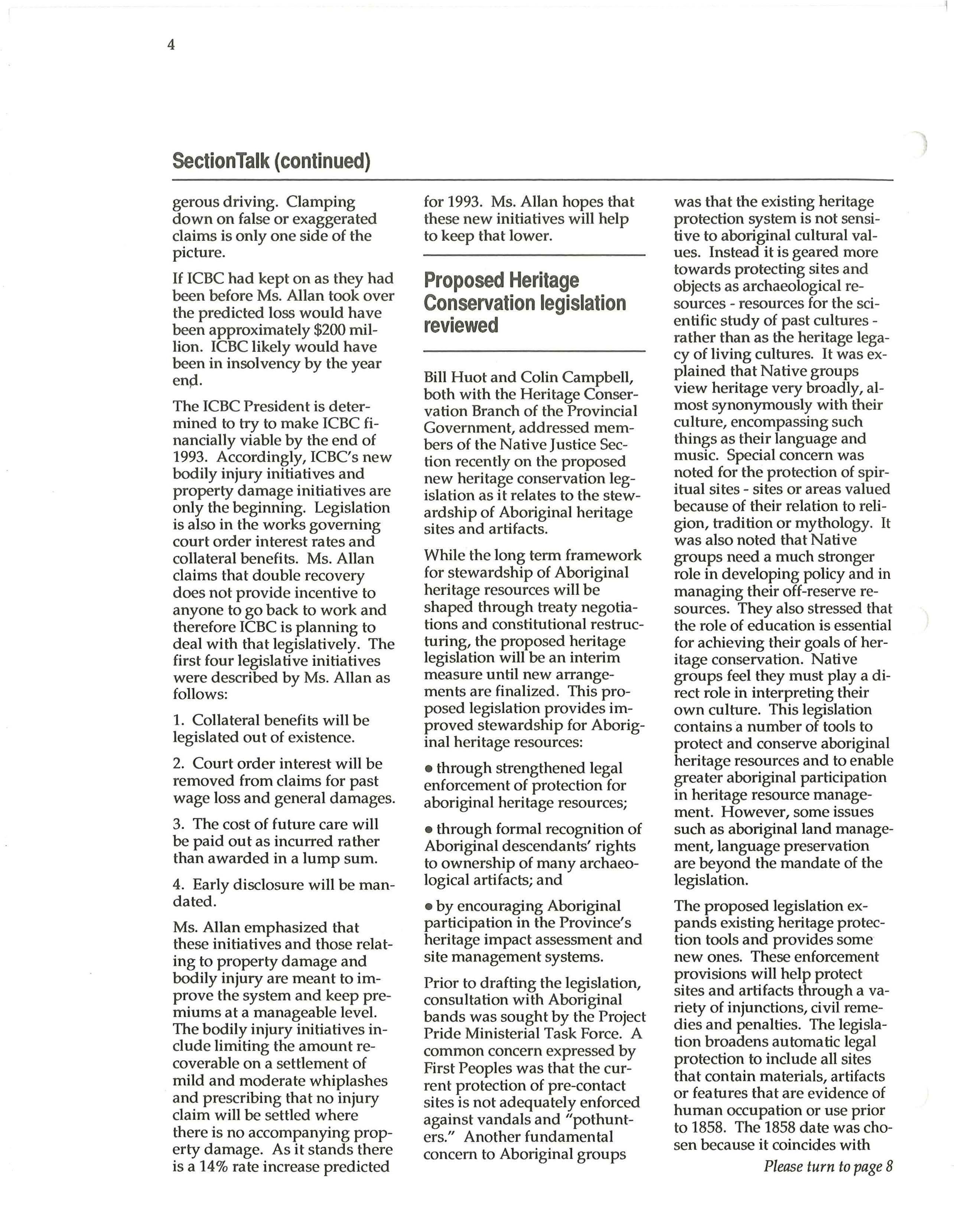 In early September, ICBC President Robyn Allan asked for the Bar's comment on four major legislative proposals with these comments to be received by the end of September. After consideration by the B.C. Branch Oct/Nov 1992 Executive, it was agreed that the Branch would cooperate and solicit comment from the Bar as well as a response from a Branch Sub-Committee. Many members responded directly and the B.C. Branch's Fair Automobile Compensation Committee also met this unrealistiVolume 4 Number 6 . cally short timeline and provided a response.