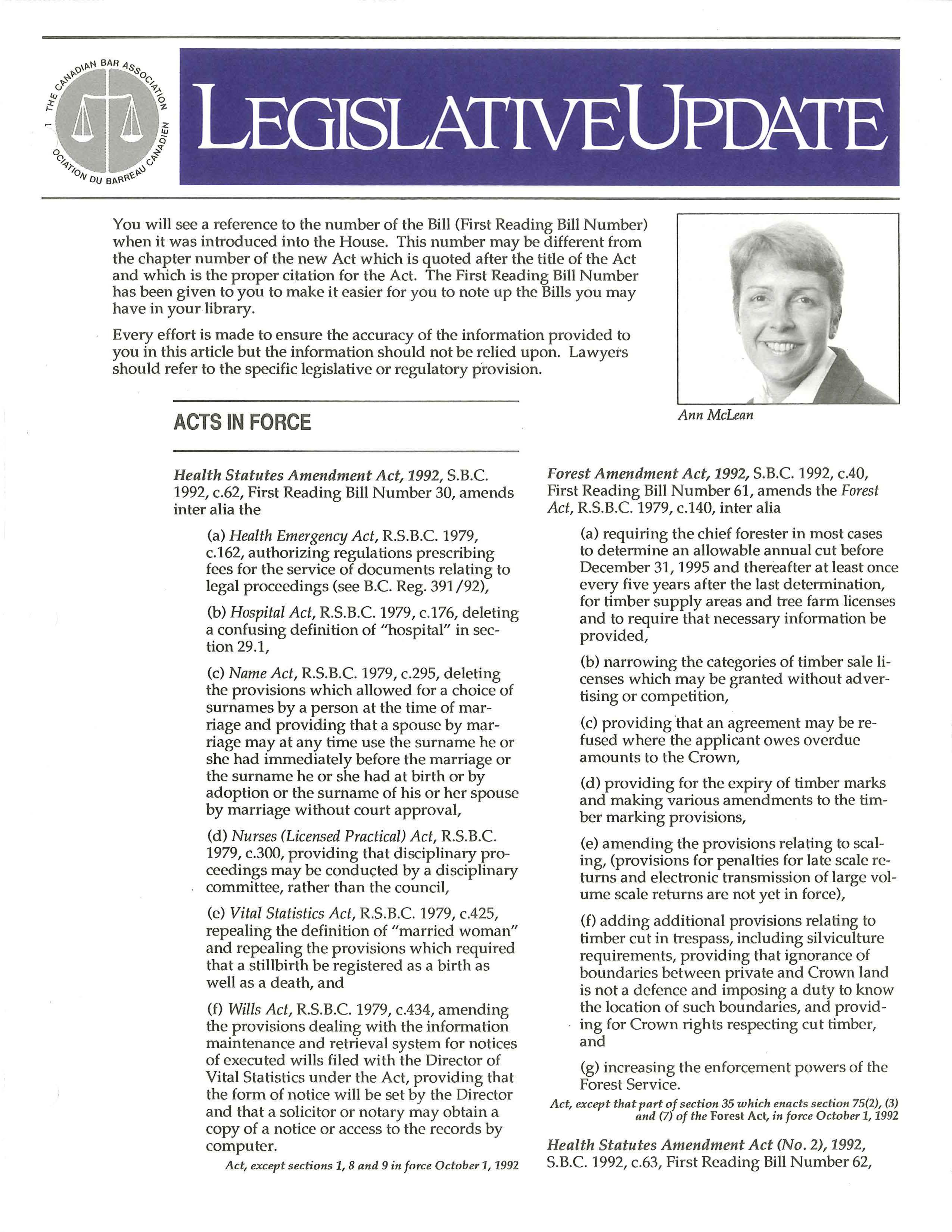 Health Statutes Amendment Act, 1992, S.B.C. 1992, c.62, First Reading Bill Number 30, amends inter alia the