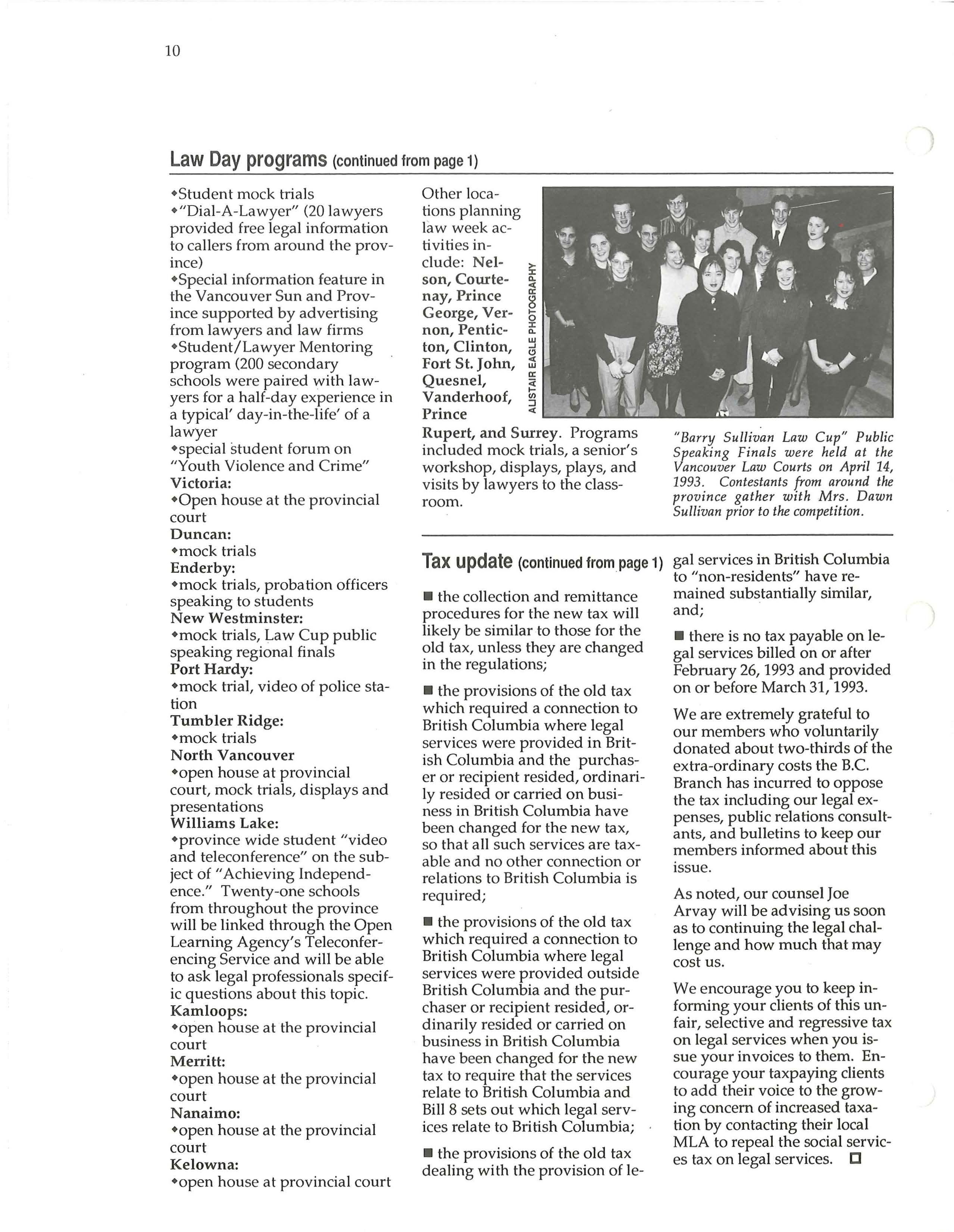 Rupert, and Surrey. Programs included mock trials, a senior's workshop, displays, plays, and visits by lawyers to the classroom.