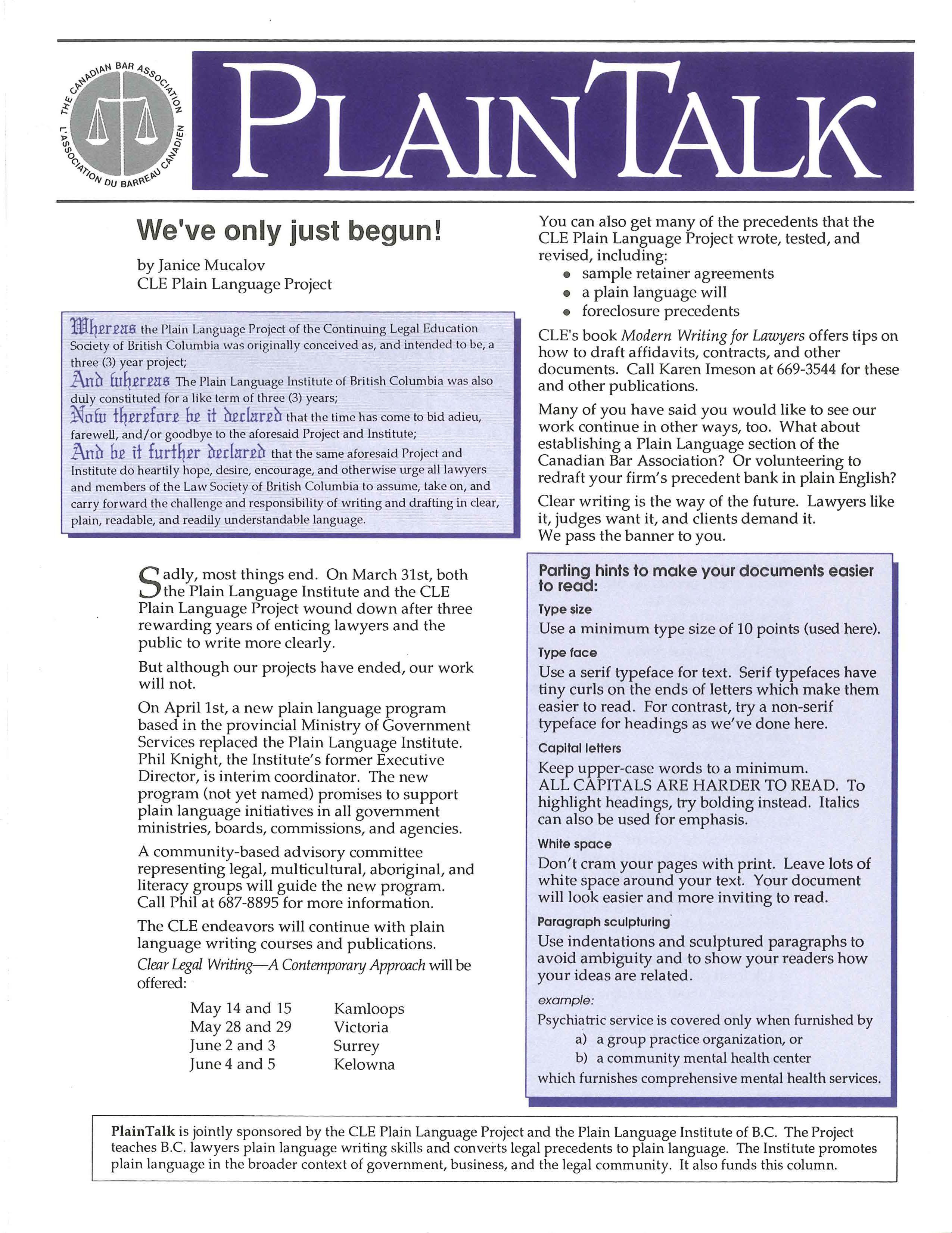 Plain Talk is jointly sponsored by the CLE Plain Language Project and the Plain Language Institute of B.C. The Project teaches B.C. lawyer s plain language writing skills and converts legal precedents to plain language. The Institute promotes plain language in the broader context of government, business , and the legal community. It also funds this column.