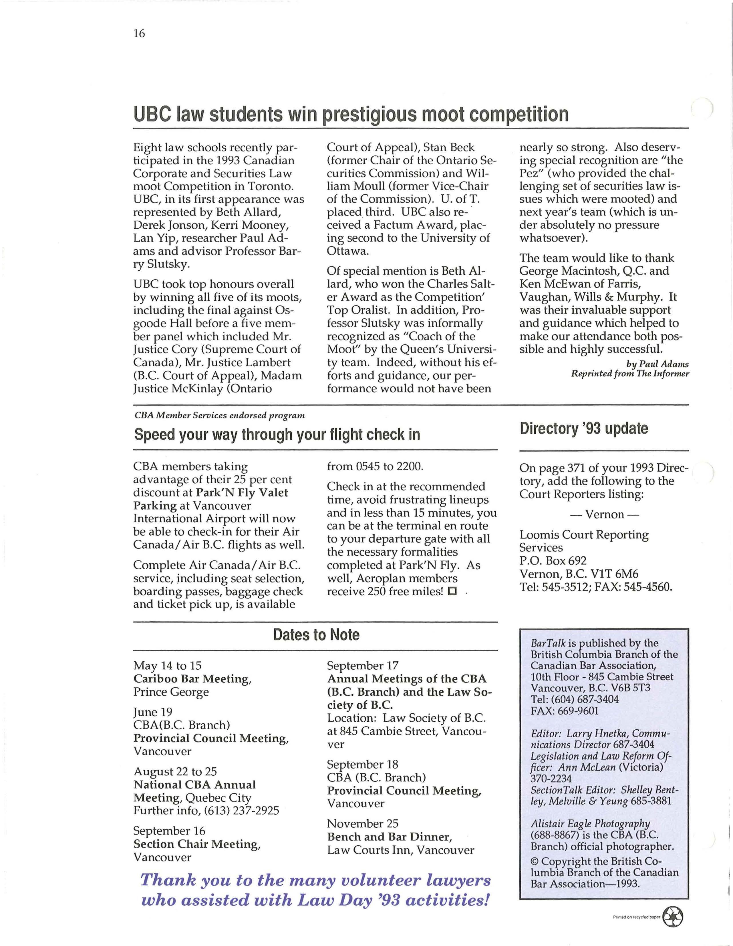 Eight law schools recently participated in the 1993 Canadian Corporate and Securities Law moot Competition in Toronto. UBC, in its first appearance was represented by Beth Allard, Derek Jonson, Kerri Mooney, Lan Yip, researcher Paul Adams and advisor Professor Barry Slutsky.