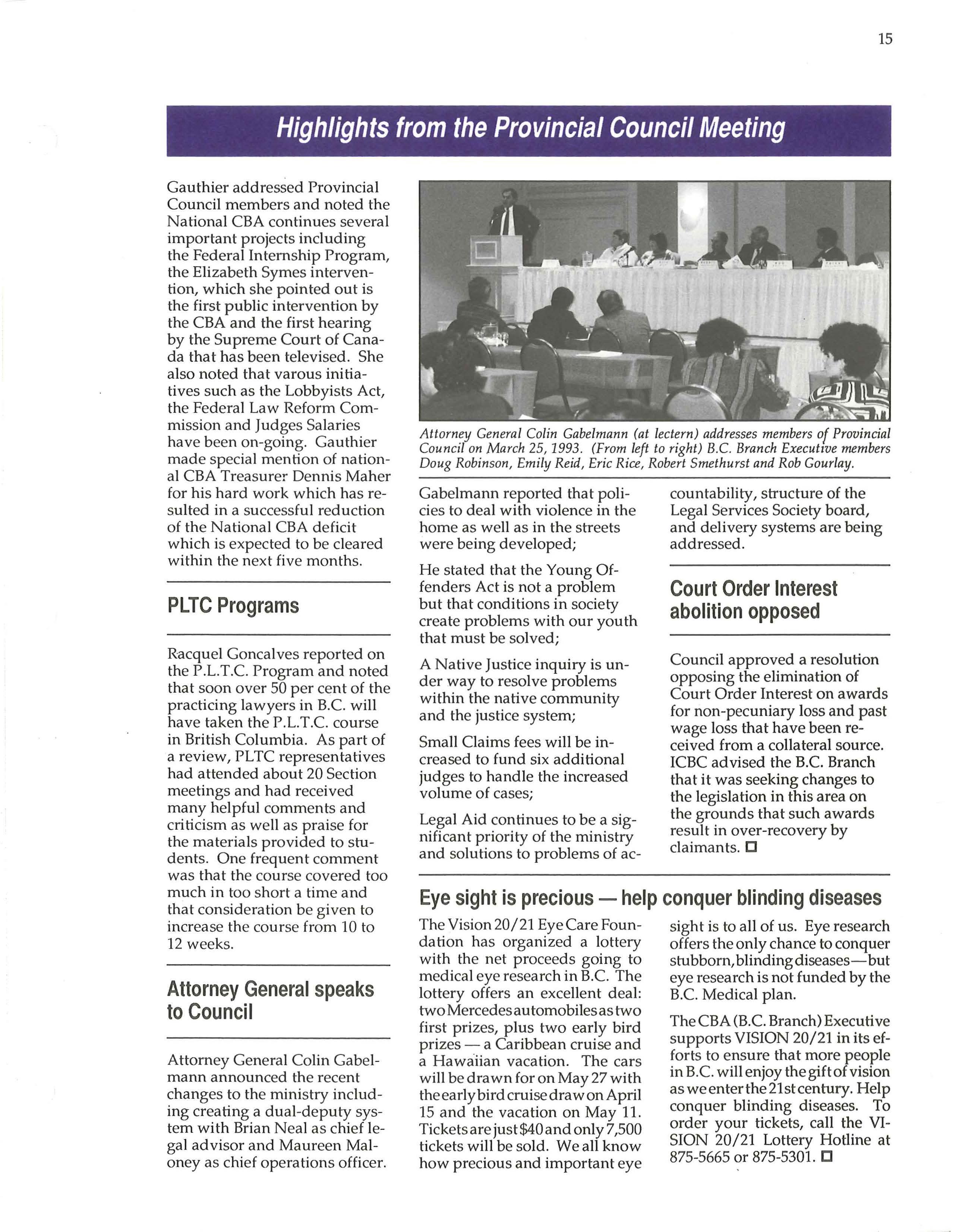 Attorney General Colin Gabelmann (at lectern) addresses members of Provincial Council on March 25 , 1993 (From left to right) B C. Branch Executive members