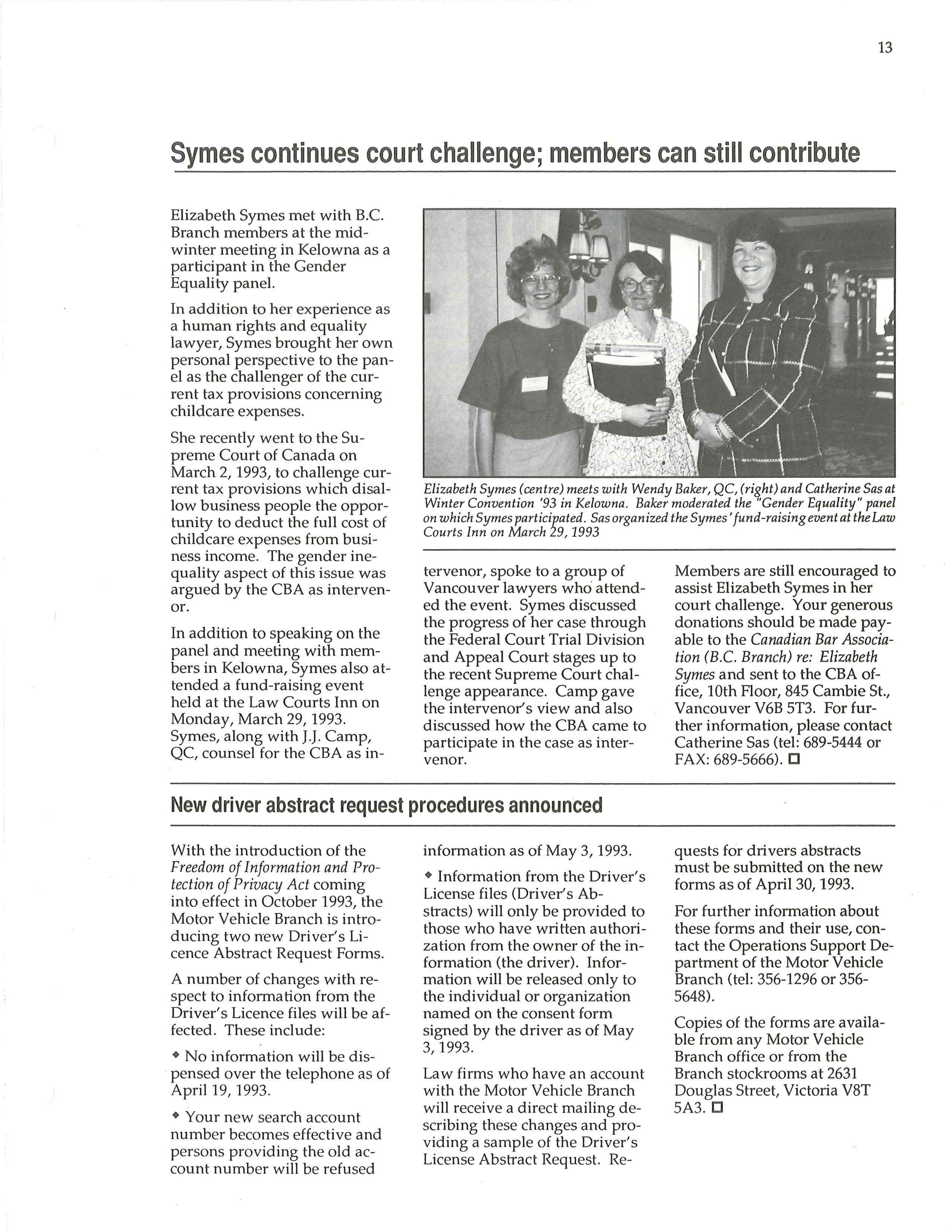 Members are still encouraged to assist Elizabeth Symes in her court challenge . Your generous donations should be made payable to the CaMdian Bar Association (B.C. Branch) re: Elizabeth Symes and sent to the CBA office, lOth Floor, 845 Cambie St., Vancouver V6B 5T3. For further information, please contact Catherine Sas (tel: 689-5444 or FAX: 689-5666). D