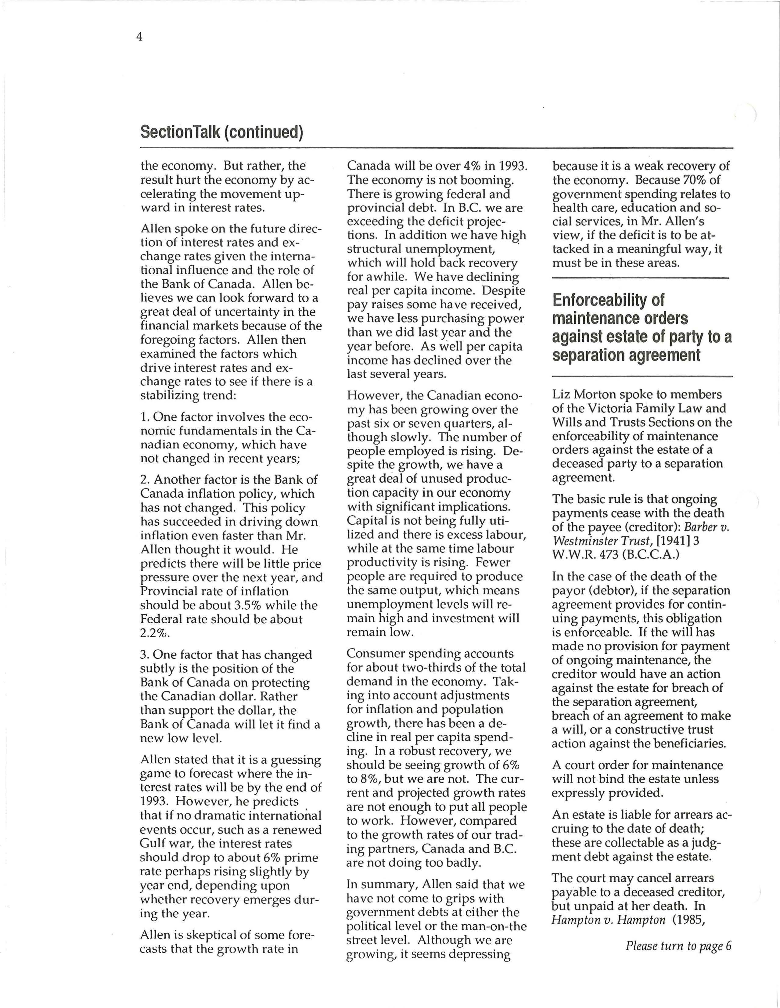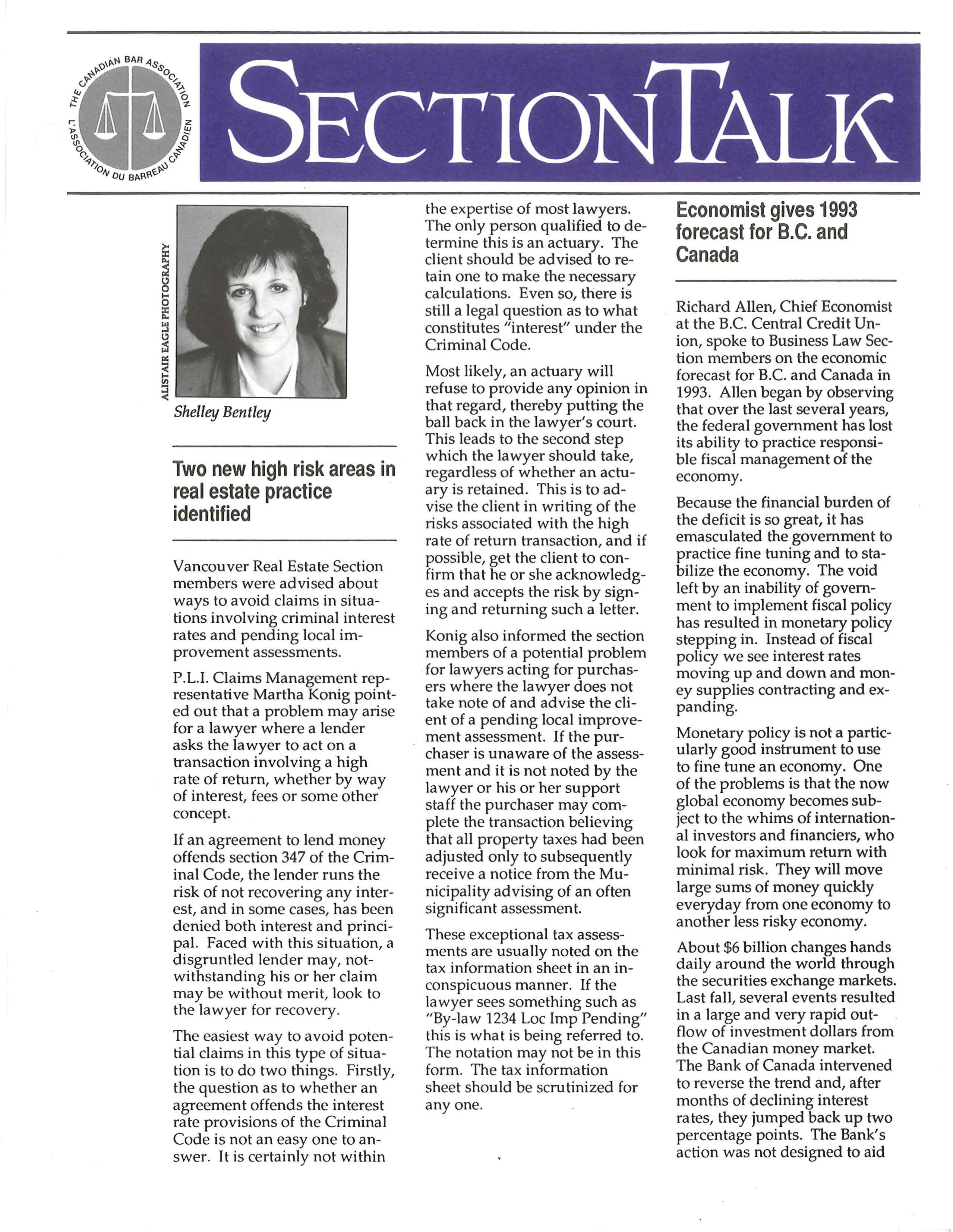 Richard Allen, Chief Economist at the B.C. Central Credit Union, spoke to Business Law Section members on the economic forecast for B.C. and Canada in 1993. Allen began by observing that over the last several years, the federal government has lost its ability to practice responsible fiscal management of the economy.