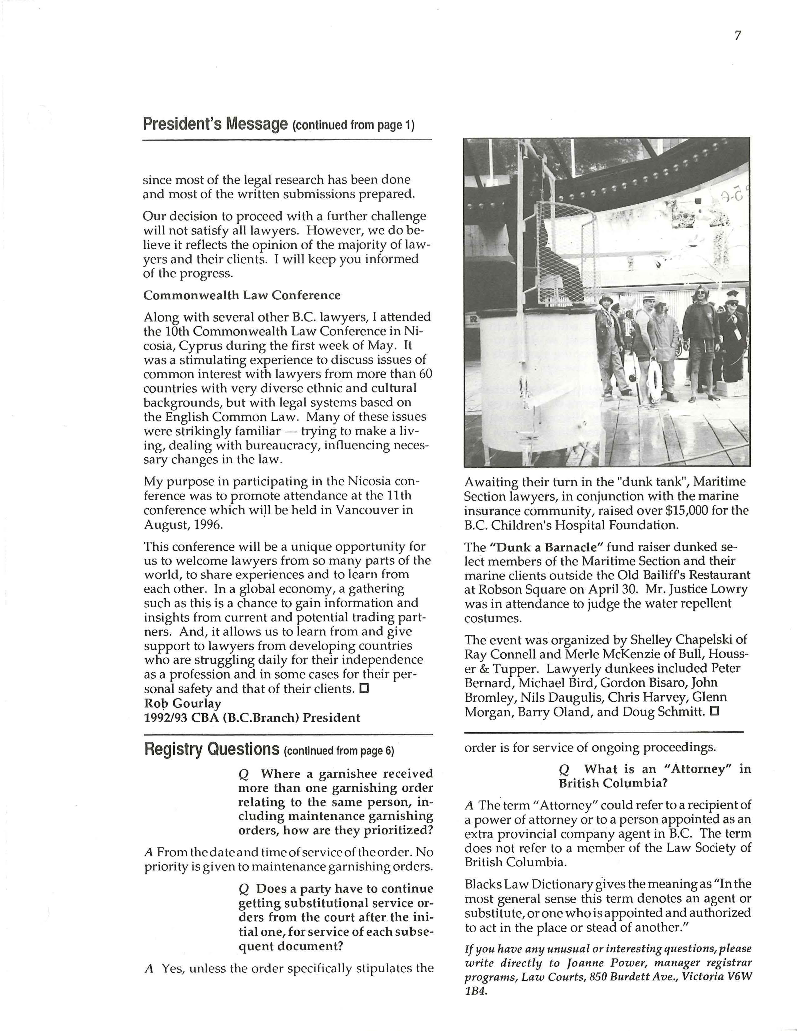 The event was organized by Shelley Chapelski of Ray Connell and Merle McKenzie of Bull, Hausser & Tupper. Lawyerly dunkees included Peter Bernard, Michael Bird, Gordon Bisaro, John Bromley, Nils Daugulis, Chris Harvey, Glenn Morgan, Barry Oland, and Doug Schmitt. D