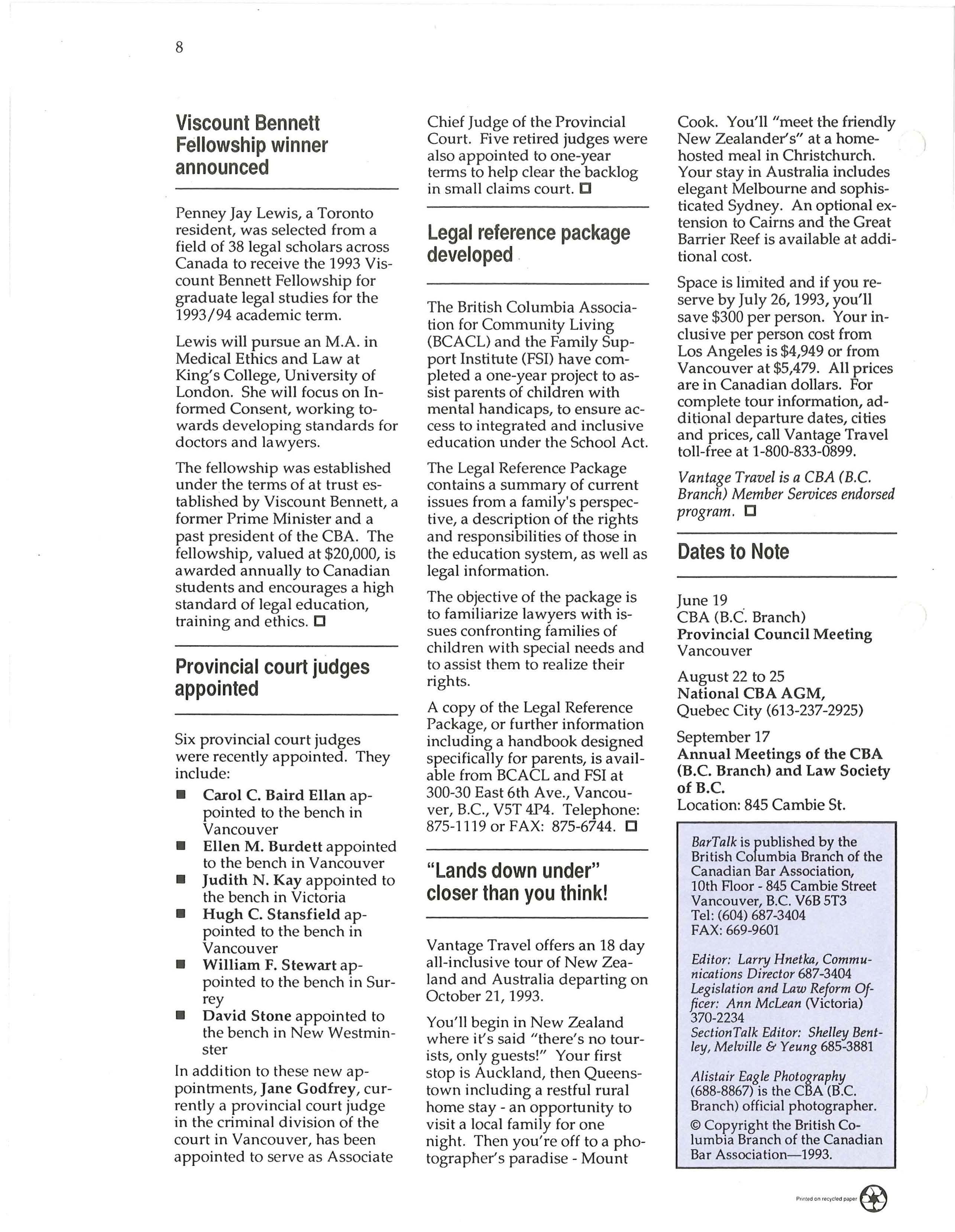 BarTalk is published by the British Columbia Branch of the Canadian Bar Association, 10th Floor - 845 Cambie Street Vancouver, B.C. V6B 5T3 Tel : (604) 687-3404 FAX: 669-9601