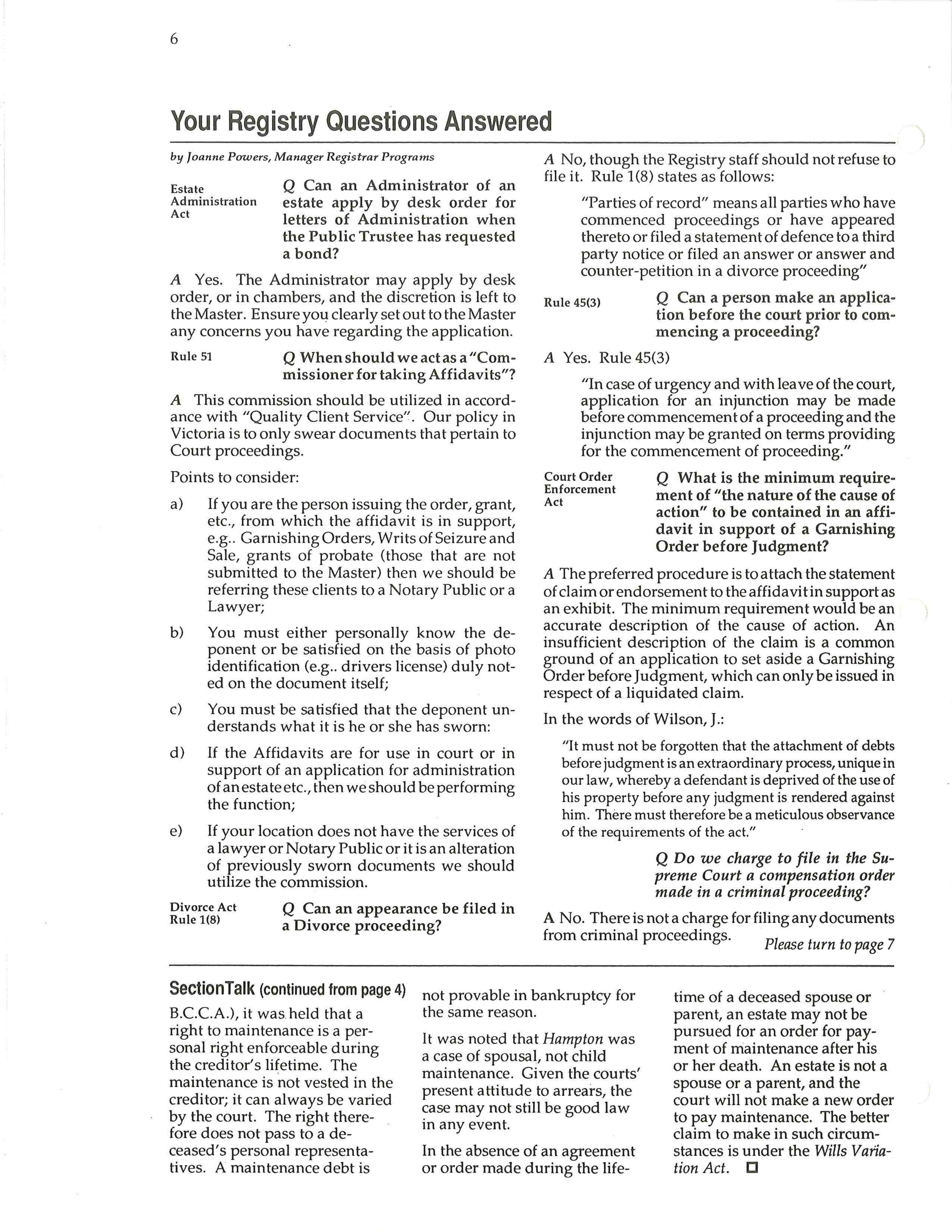 If you have any unusual or interesting questions, please write directly to Joanne Power, manager registrar programs, Law Courts, 850 Burdett Ave., Victoria V6W 1B4.