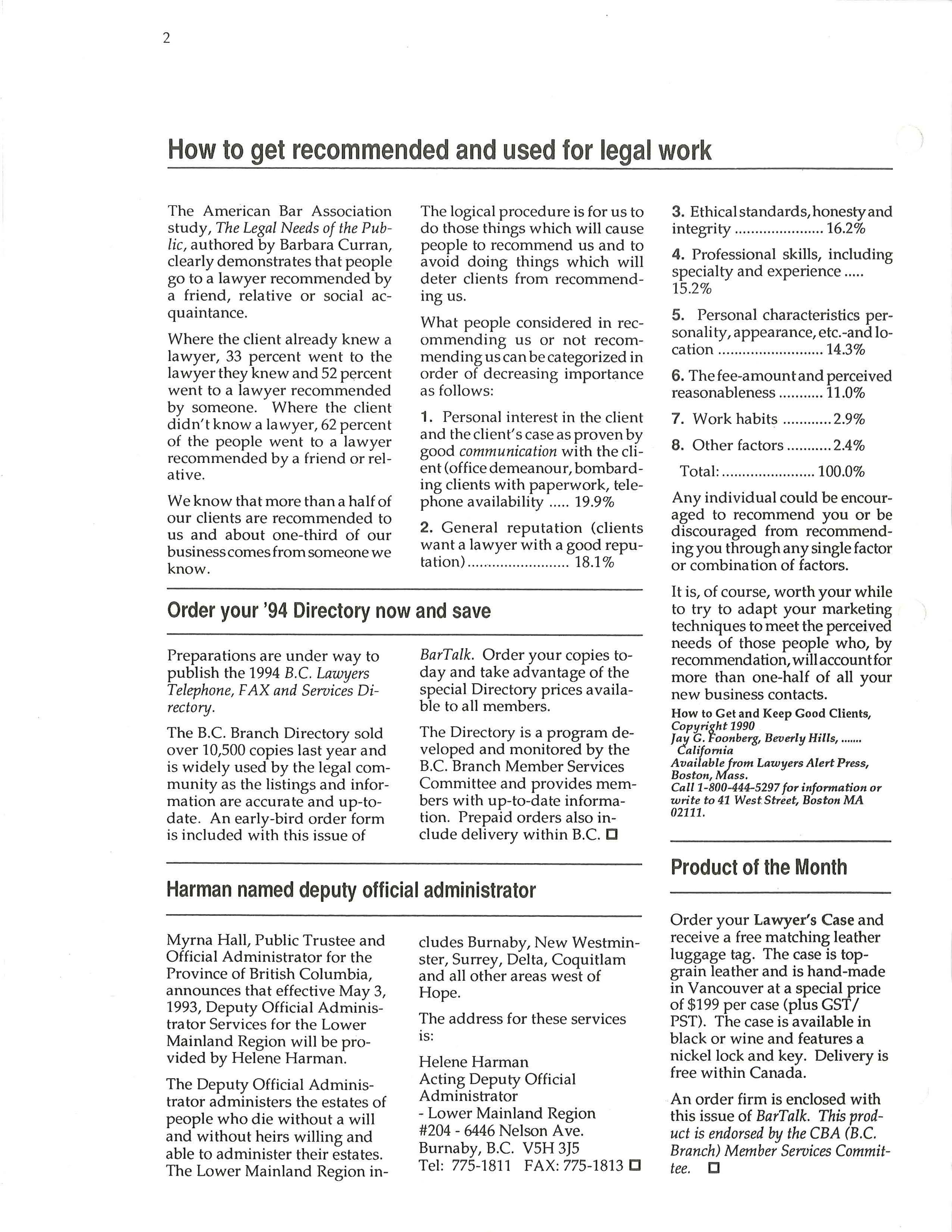 An order firm is enclosed with this issue of BarTalk. This product is endorsed by the CBA (B.C. Branch) Member Services Committee D