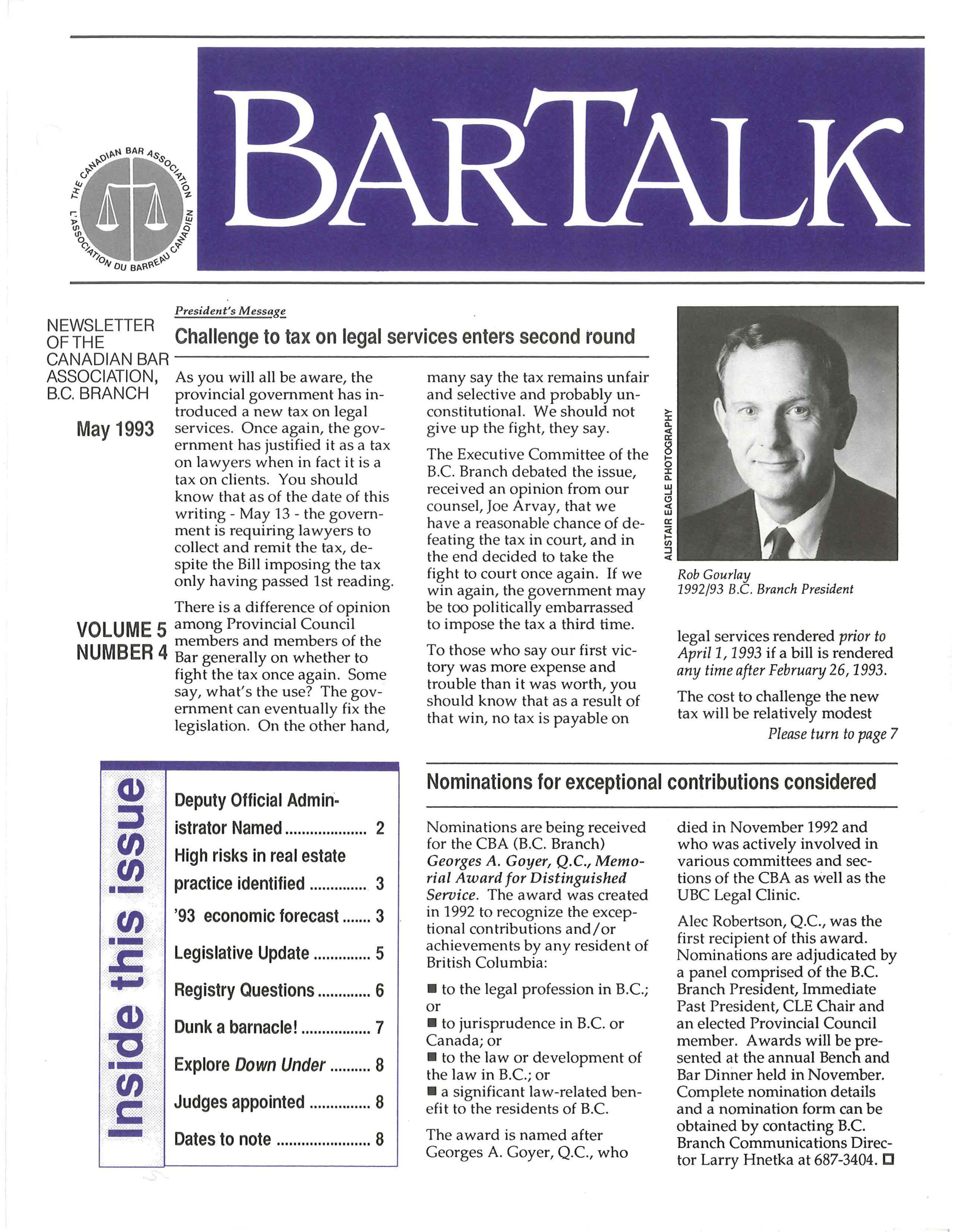 As you will all be aware, the provincial government has introduced a new tax on legal services . Once again, the government has justified it as a tax on lawyers when in fact it is a tax on clients. You should know that as of the date of this writing- May 13 - the government is requiring lawyers to collect and remit the tax, despite the Bill imposing the tax only having passed 1st reading. There is a difference of opinion VOLUME 5 among Provincial Council members and members of the NUMBER 4 Bar generally on whether to fight the tax once again. Some say, what's the use? The government can eventually fix the legislation On the other hand,