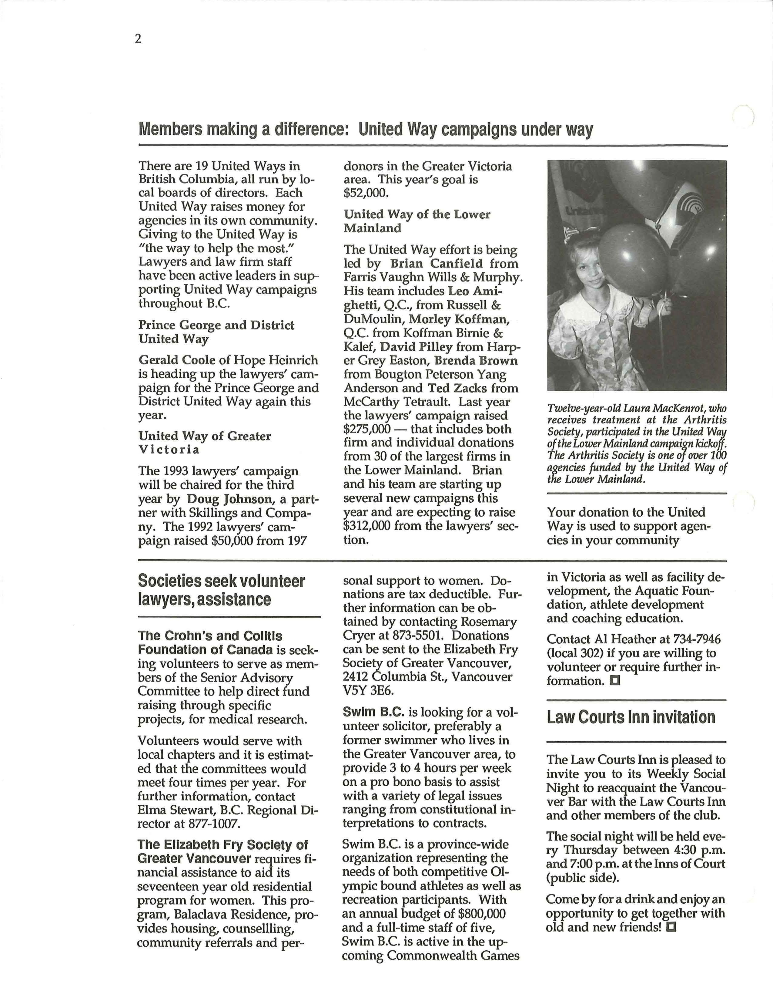 The United Way effort is being led by Brian Canfield from Farris Vaughn Wills & Murphy . His team includes Leo Amighetti, Q.C., from Russell & DuMoulin, Morley Koffman, Q.C. from Koffman Birnie & Kalef, David Pilley from Harper Grey Easton, Brenda Brown from Bougton Peterson Yang Anderson and Ted Zacks from McCarthy Tetrault. Last year the lawyers' campaign raised $275,000 - that includes both firm and individual donations from 30 of the largest firms in the Lower Mainland. Brian and his team are starting up several new campaigns this year and are expecting to raise $312,000 from the lawyers' section.
