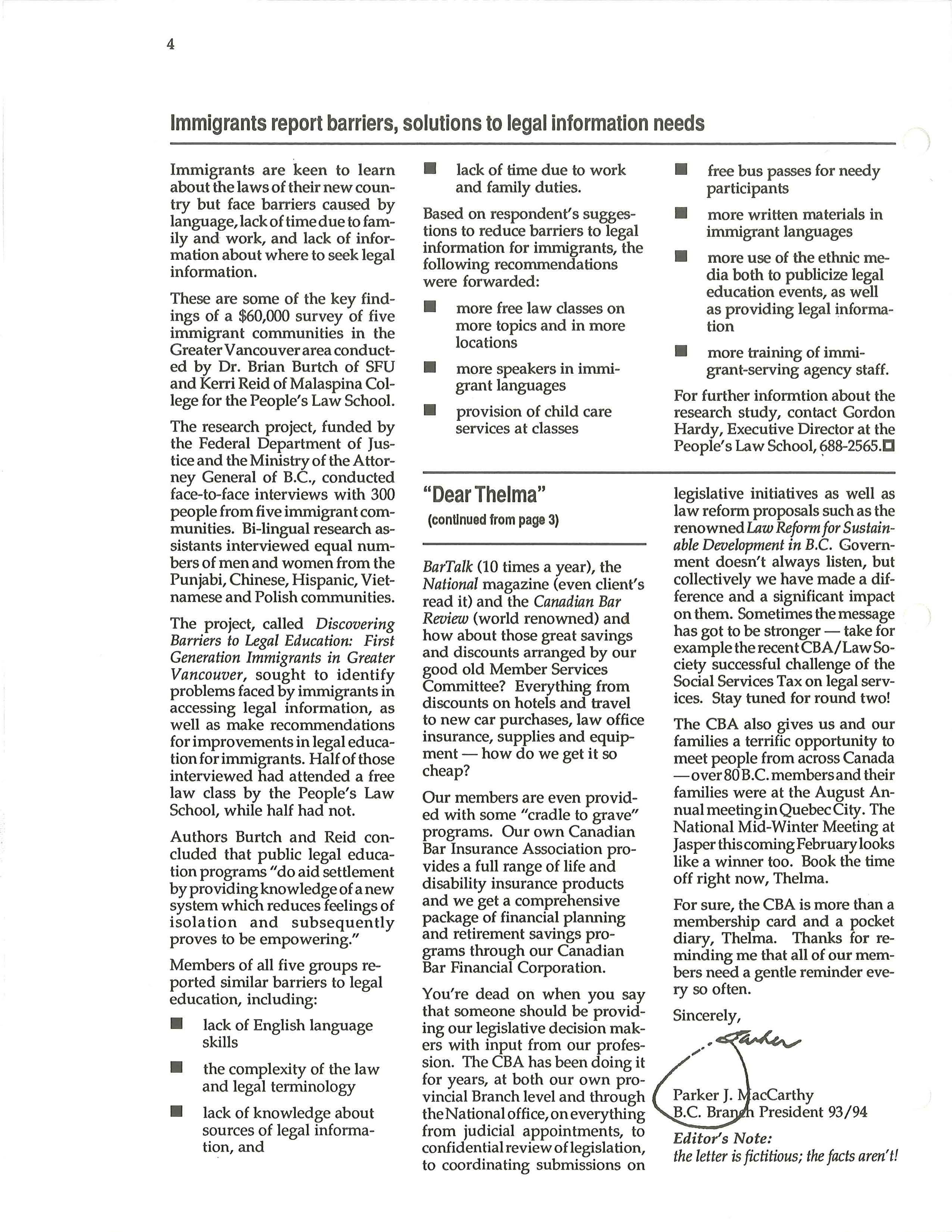 Just to remind you, Thelma, it's "us", your B.C. Branch of the CBA who has the responsibility to review provincial legislation, initiate law reform measures, advance and improve the administration of justice, and to help ensure that the continuing legal education needs of lawyers are being met. While the Law Society has got "public interest'' as a mandate, we have proper self interest as part of our "to do list." Between us, we cover the bases and try to coordinate our efforts.