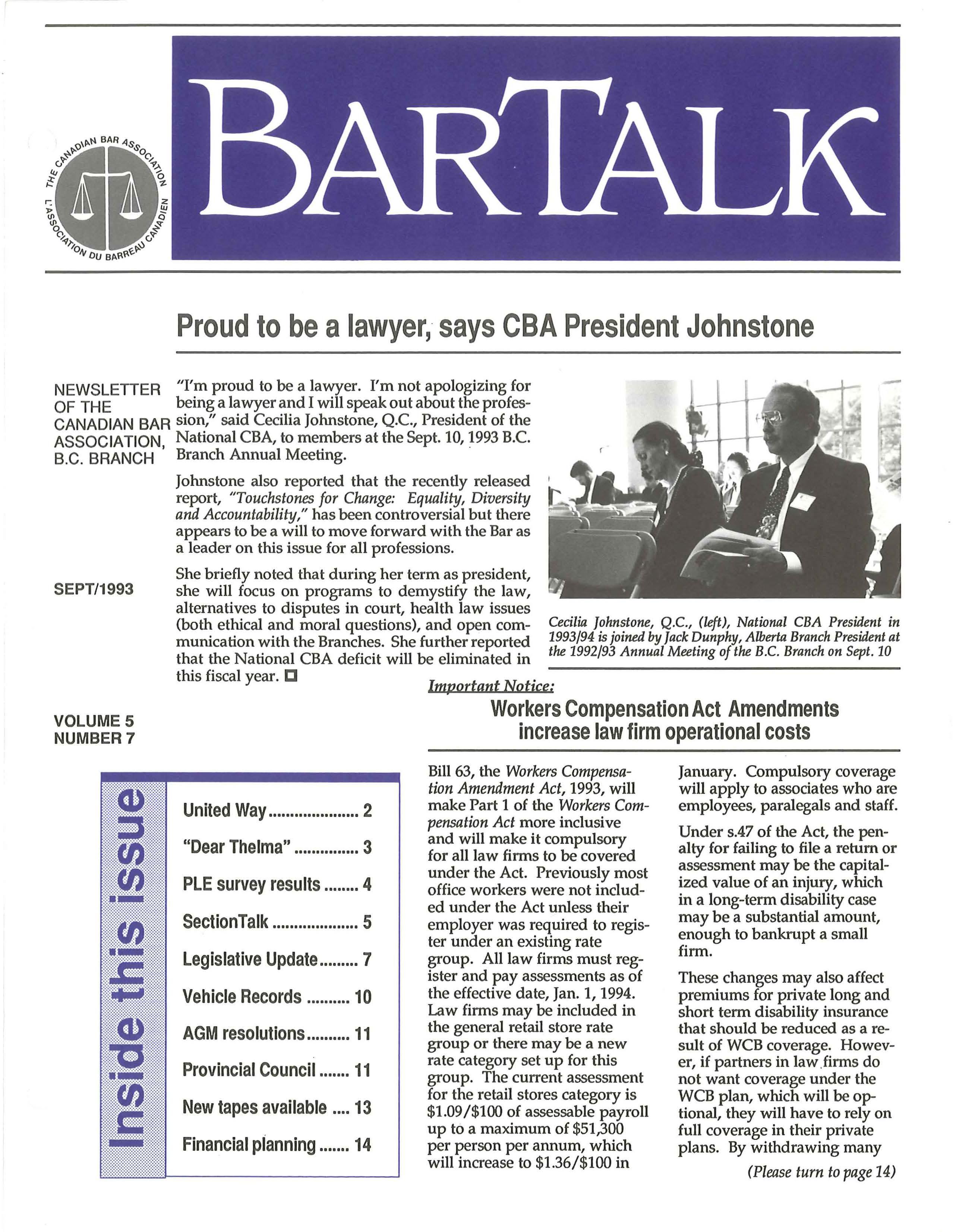 NEWSLETTER "I'm proud to be a lawyer. I'm not apologizing for OF THE being a lawyer and I will speak out about the profesCANADIAN BAR sion," said Cecilia Johnstone, Q.C., President of the ASSOCIATION, National CBA, to members at the Sept. 10, 1993 B.C. B.C. BRANCH Branch Annual Meeting.