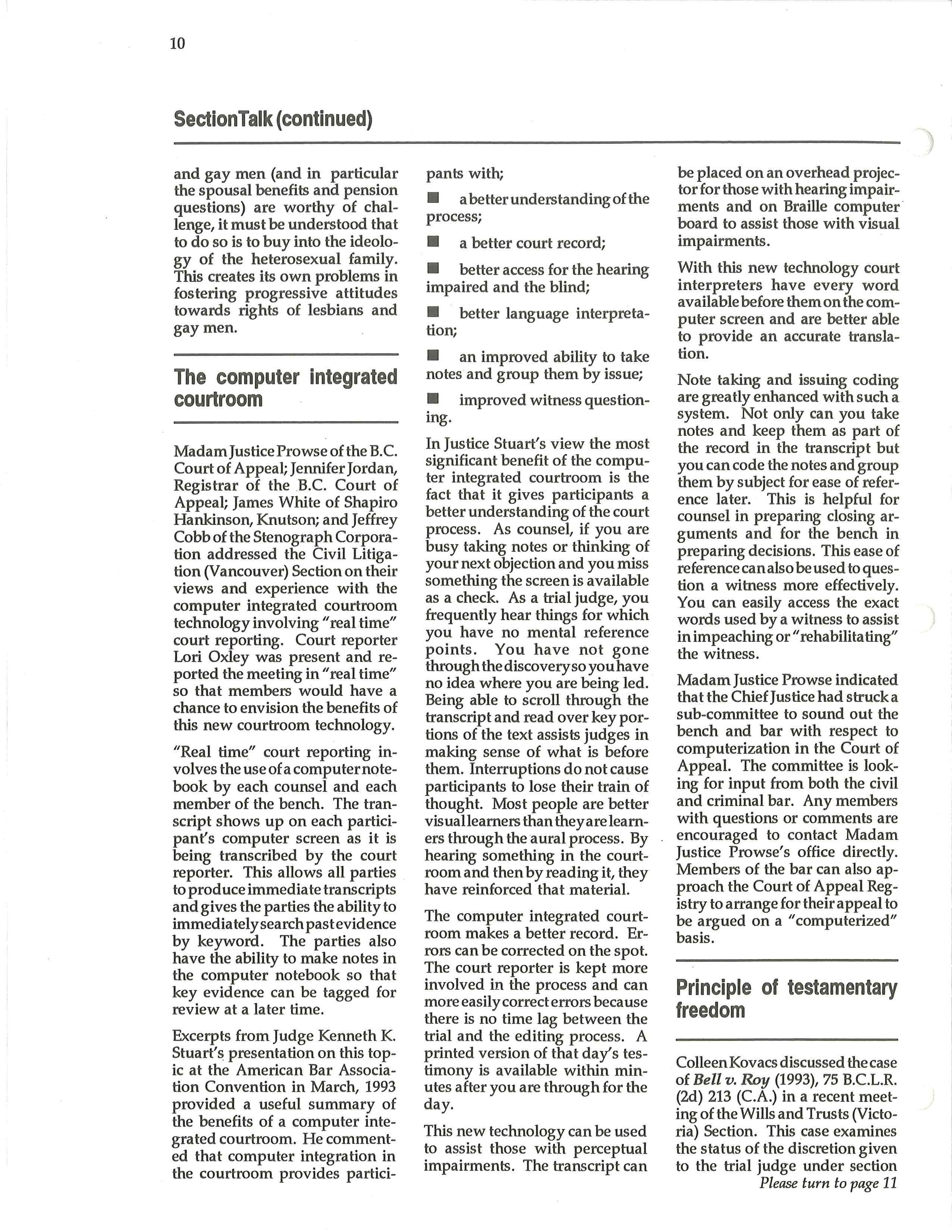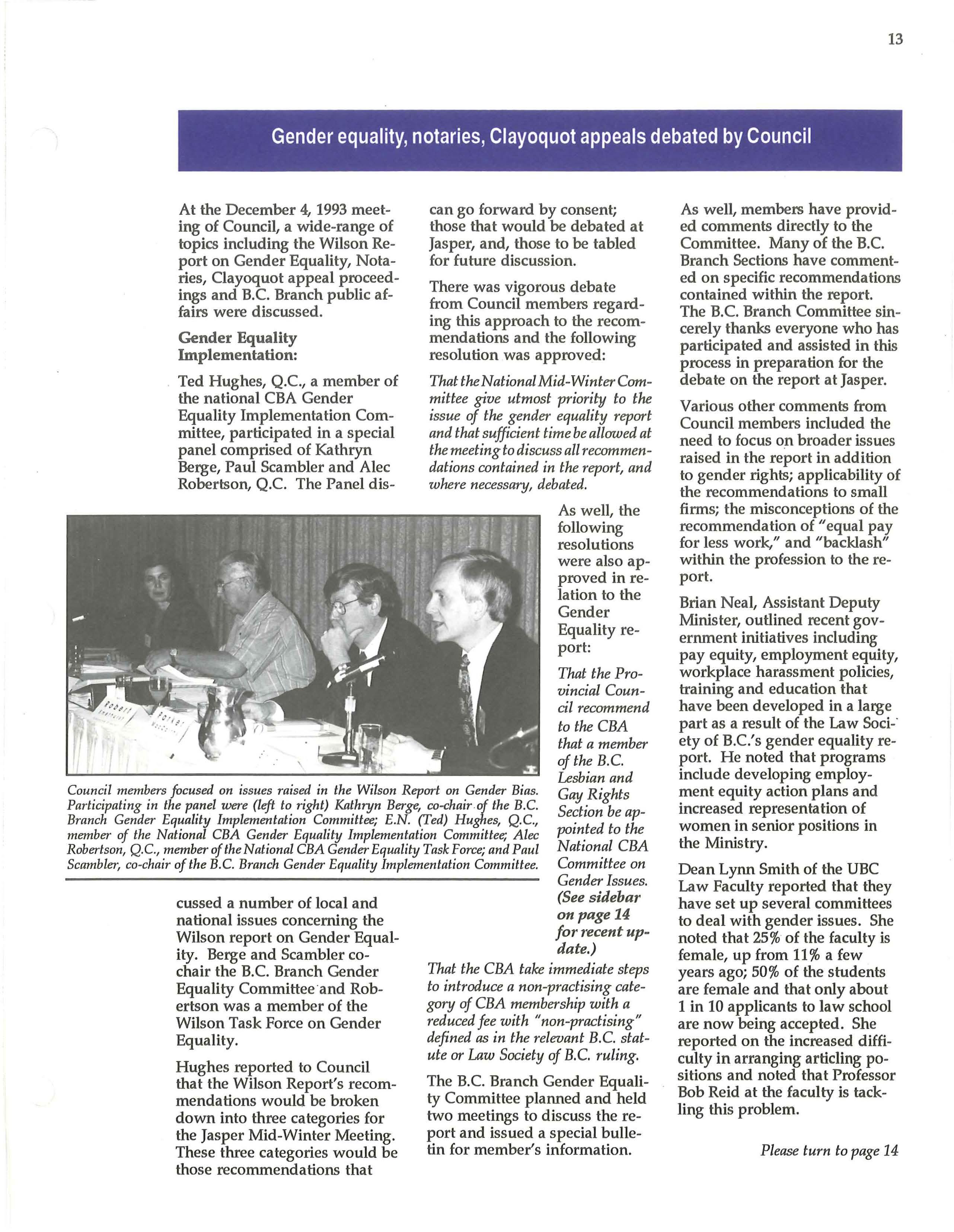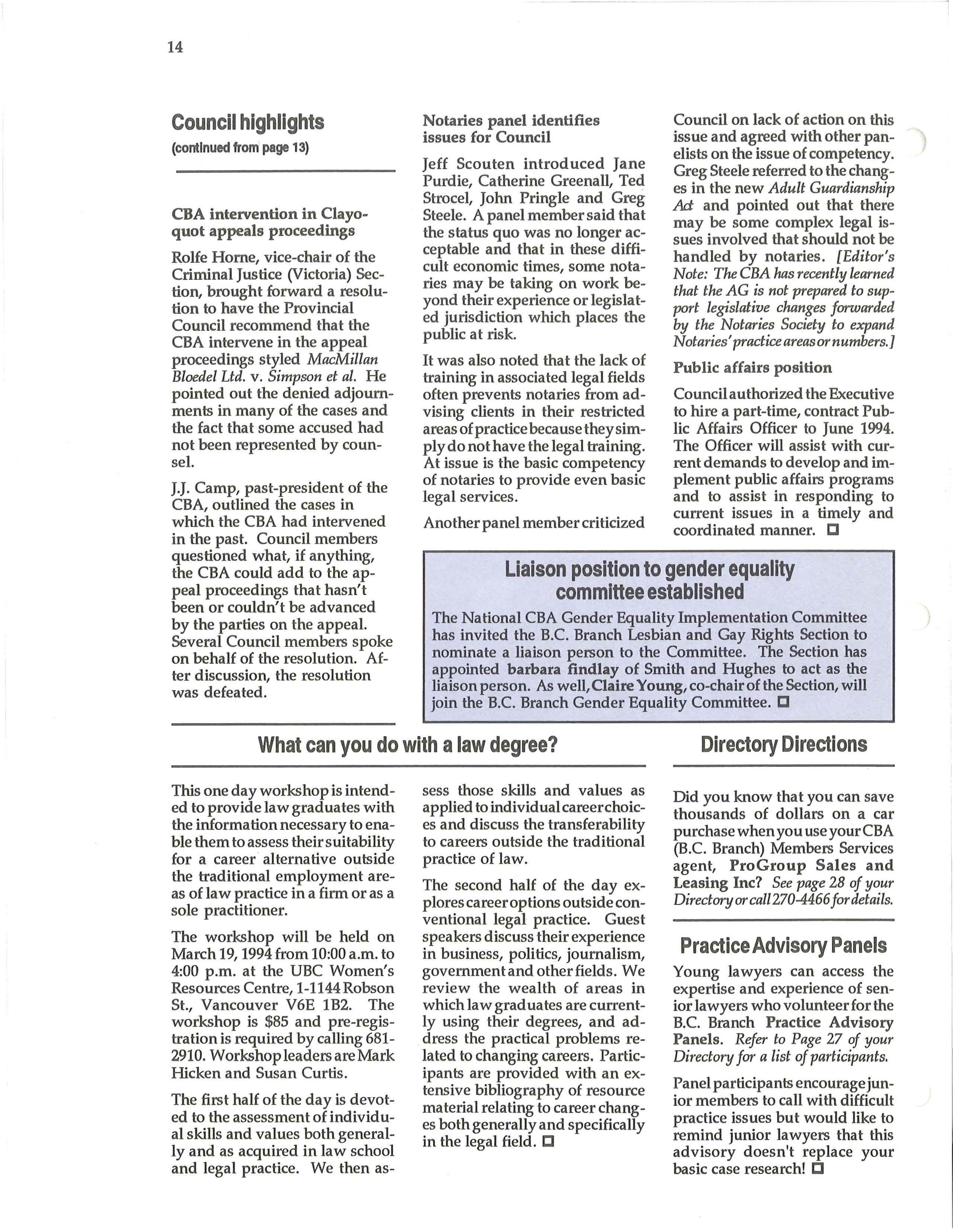 The National CBA Gender Equality Implementation Committee has invited the B.C. Branch Lesbian and Gay Rights Section to nominate a liaison person to the Committee. The Section has appointed barbara findlay of Smith and Hughes to act as the liaison person. As well, Oaire Young, co-chair of the Section, will join the B.C. Branch Gender Equality Committee. C