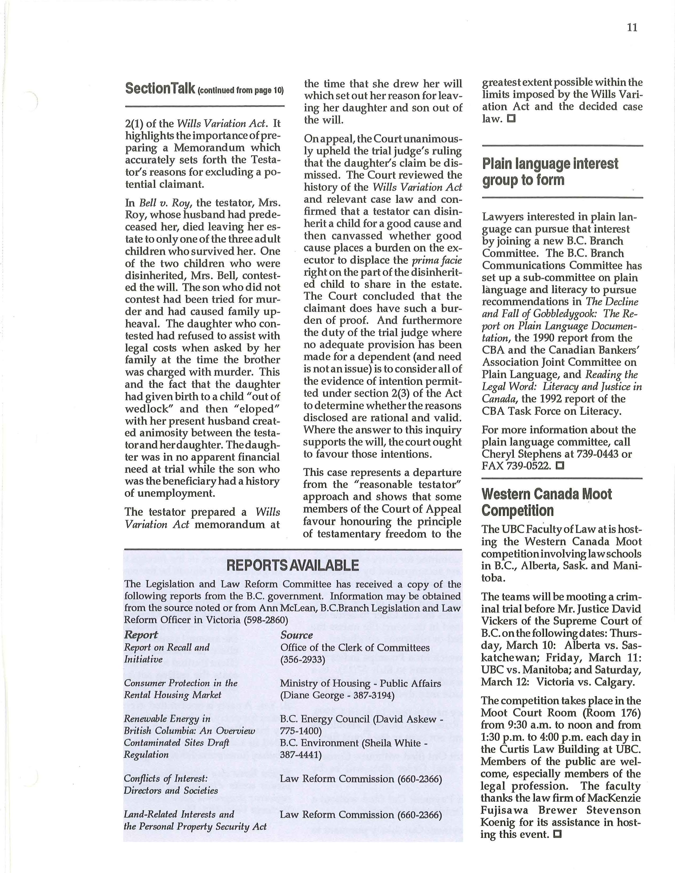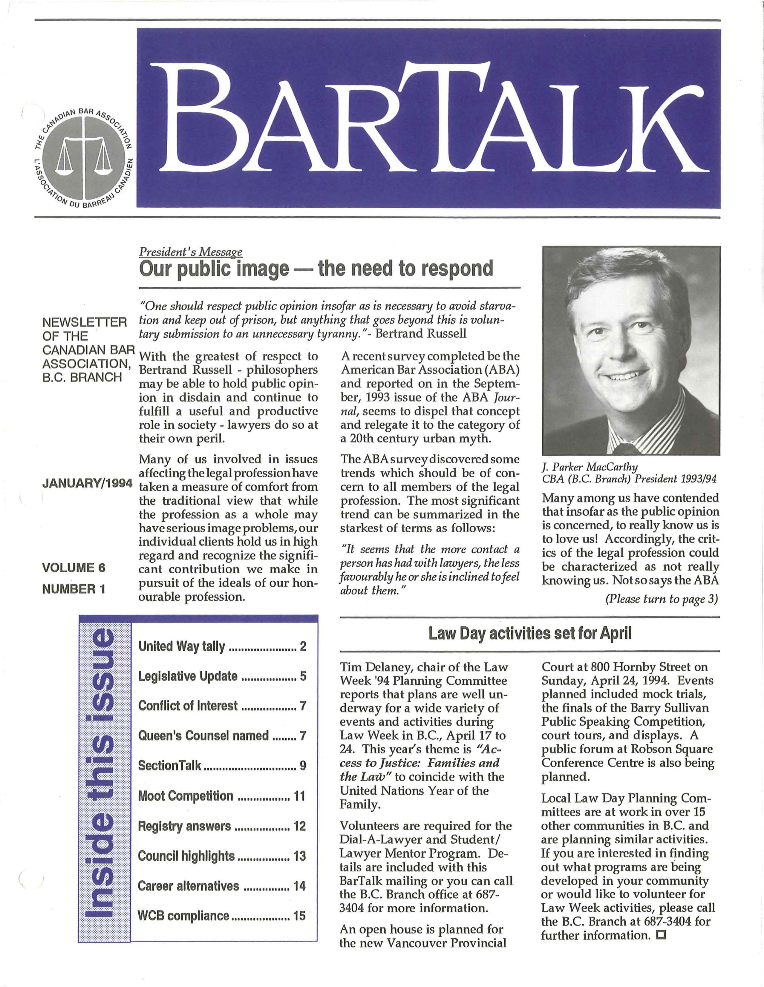 BarTalk is published by the British Columbia Branch of the Canadian Bar Association, lOth Floor - 845 Cambie Street Vancouver, B.C. V6B 5T3 Tel: (604) 687-3404 FAX: 669-9601