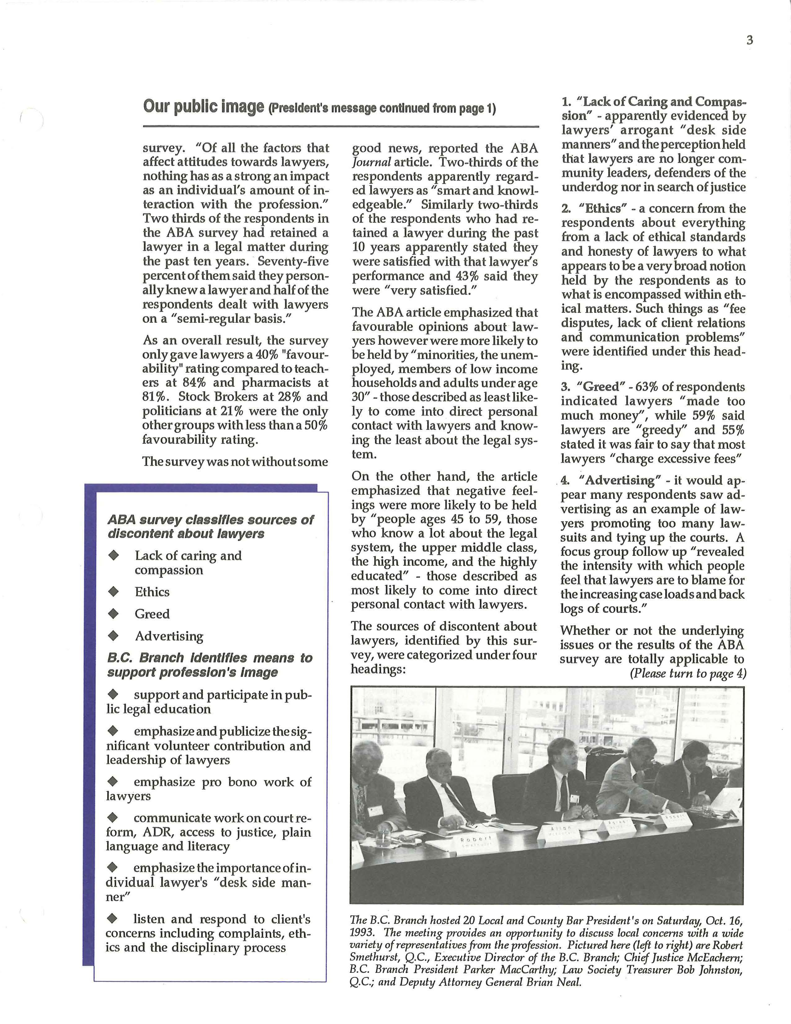 The B.C. Branch hosted 20 Local and County Bar President's on Saturday, Oct. 16, 1993. The meeting provides an opportunity to discuss local concerns with a wide variety of representatives from the profession. Pictured here (left to right) are Robert Smethurst, Q.C., Executive Director of the B.C. Branch; Chief Justice McEachern; B.C. Branch President Parker MacCarthy; Law Society Treasurer Bob John ston, Q.C.; and Deputy Attorney General Brian Neal. ·