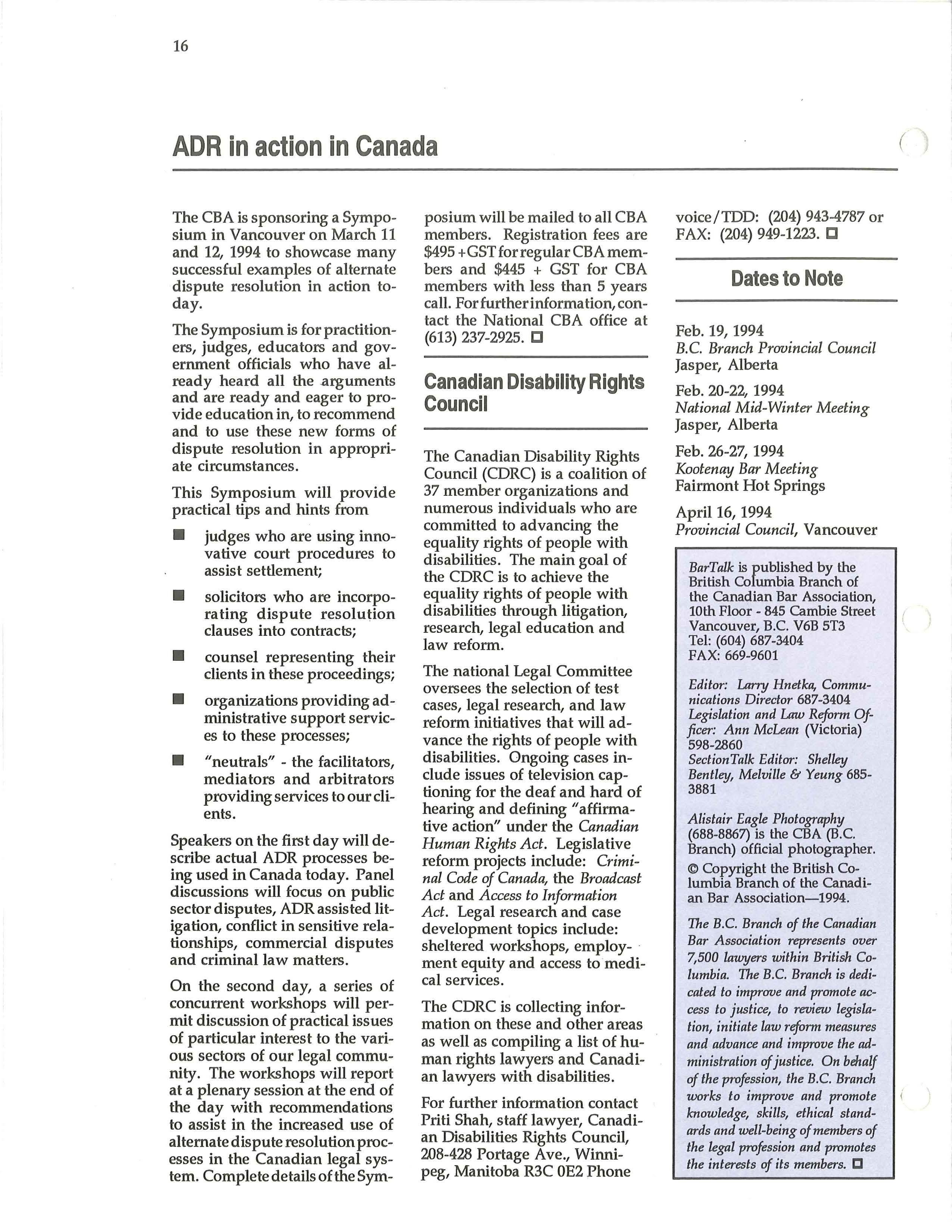 The CBA is sponsoring a Symposium in Vancouver on March 11 and 12, 1994 to showcase many successful examples of alternate dispute resolution in a ction today.