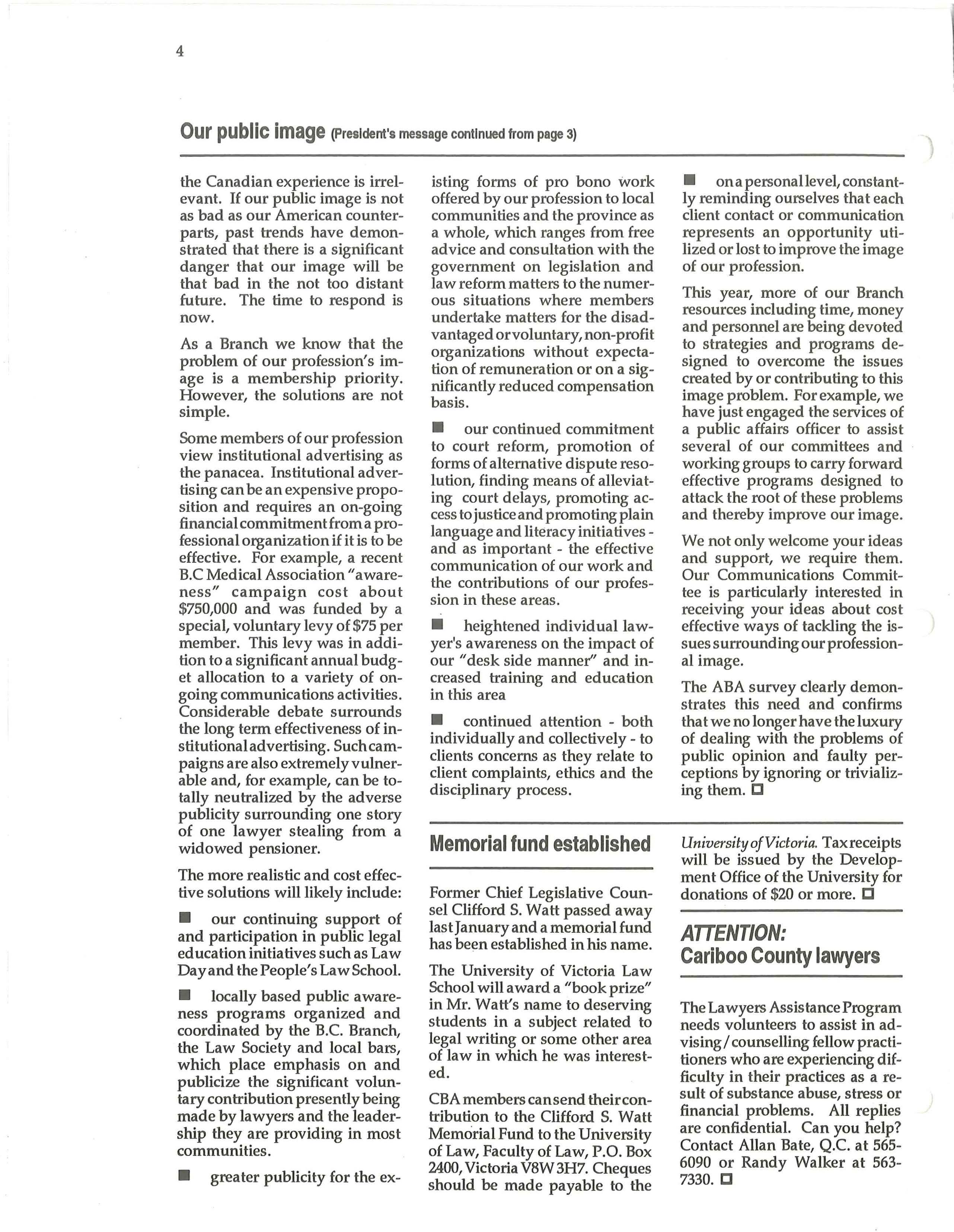 CBA members can send their contribution to the Clifford S. Watt Memorial Fund to the University of Law, Faculty of Law, P.O. Box 2400, Victoria V8W 3H7. Cheques should be made payable to the