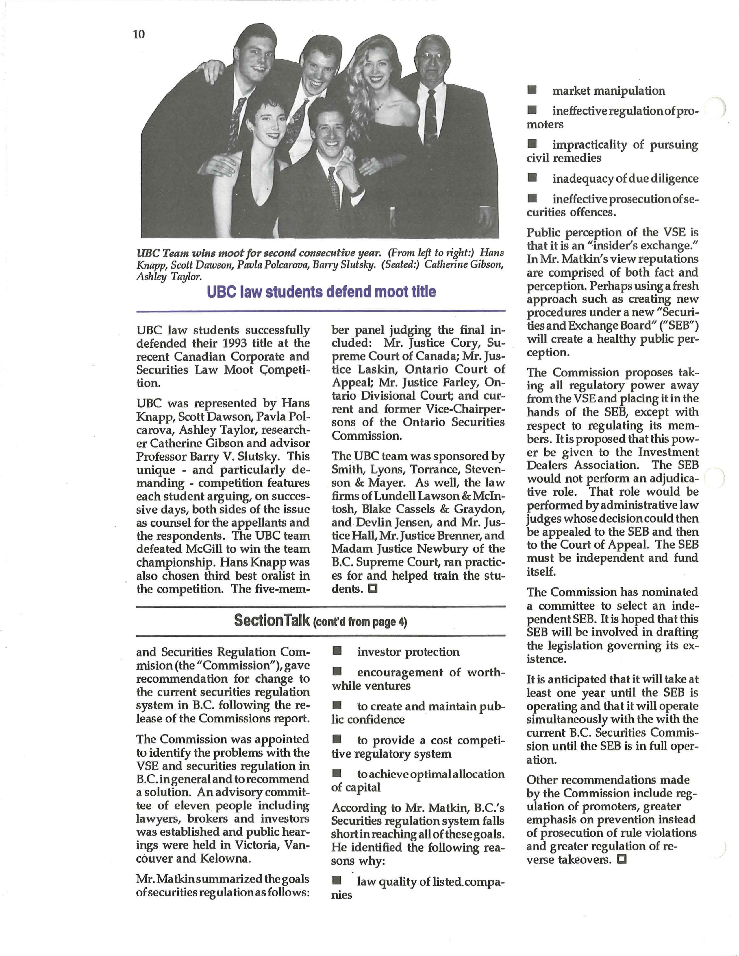 Law Day '94 focused on the theme of "Families and the Law." A feature at the Open House af Vancouver Provincial Court at BOO Hornby Street was a public forum discussing the topic: Family Violence: A Public or Private Matter? Forum participants included: (back row; left to right) Kevin Evans, CBC news andwr; Brenda Toll, Director of Regional Classification at the Surrey Pre-Trial Services Centre; Dr. Anton Gruenfeld, physician at the Vancouver General Hospital Emergency Ward; Shashi Assinand, Executive Director, Vancouver and Lower Mmnland Cultural Family Services Society; Superintendent Jlrian McGuiness, Vancouver Police Department; Patricia Graham, Senior Editor, Vancouver Sun; Ian Guthrie, Forum Coordinator, Continuing Legal Education Society. (Seated, left to right) Judith Milliken, Senior Crown Counsel; Judge Jane Godfrey, Associate OJief]udge of B.C.; Dr. Stephen Hart, SFU Clinical Forensic Psychologist; Mary Clifford, Pnnce George Native Friendship Centre.