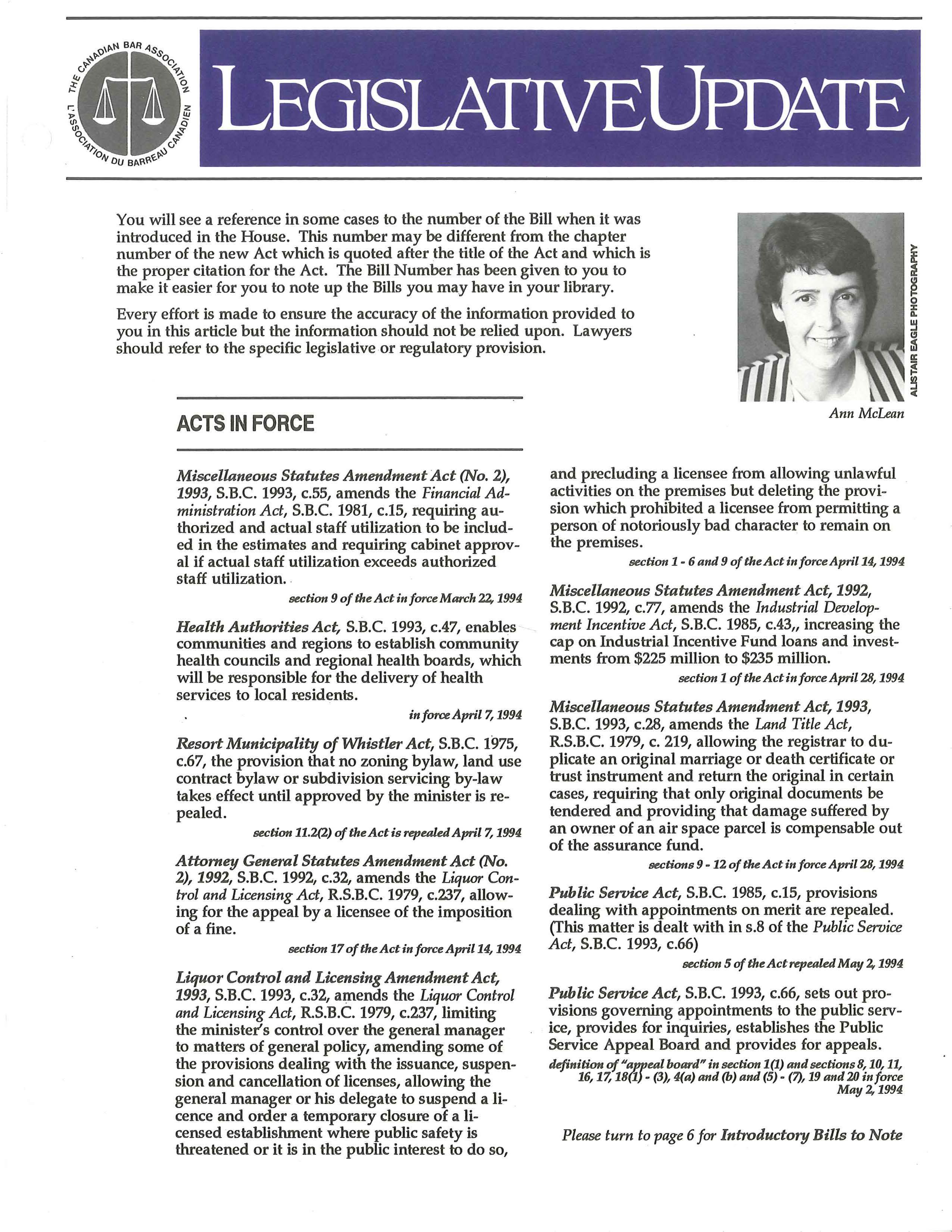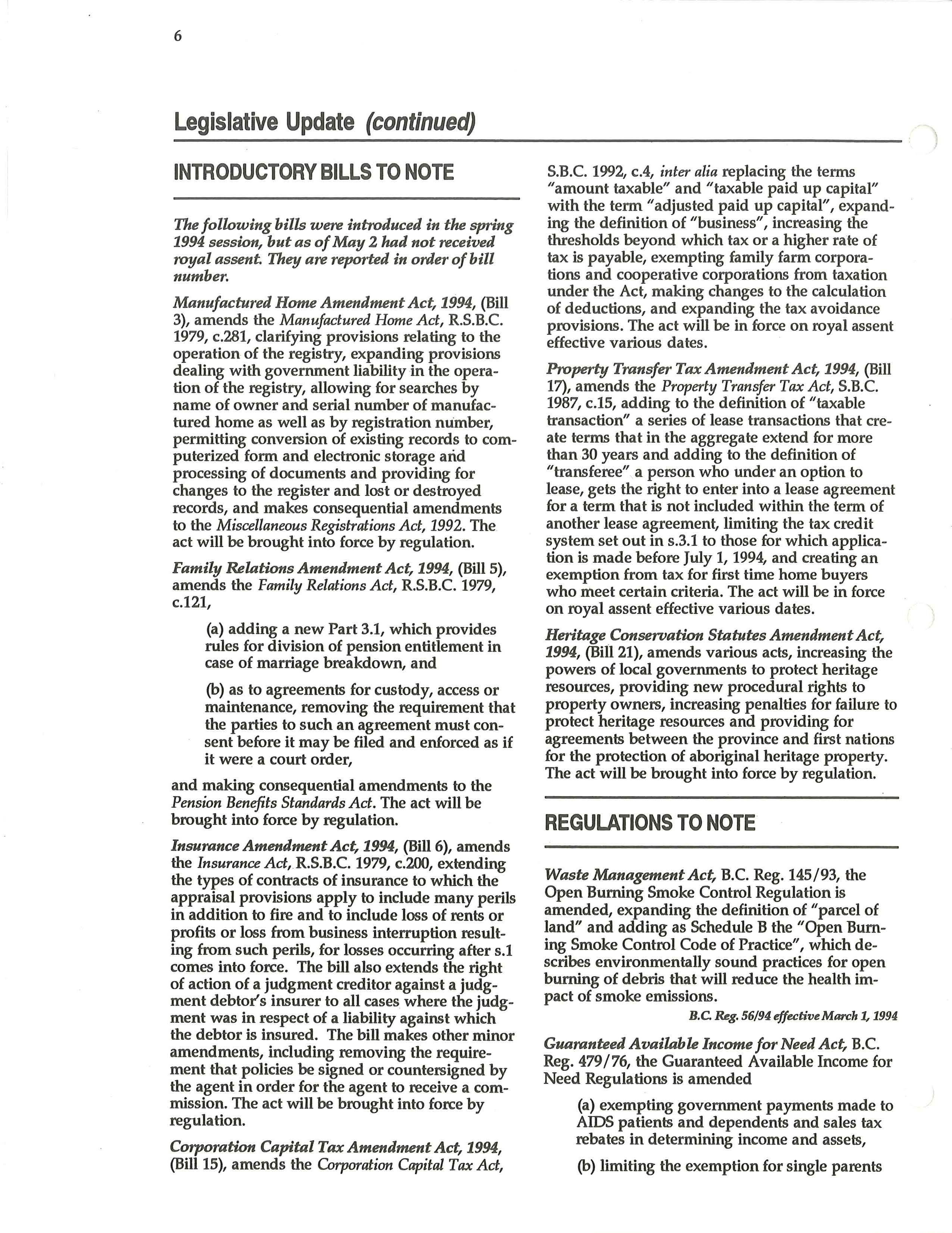 The following bills were introduced in the spring 1994 session, but as of May 2 had not received royal assent They are reported in order of bill number.