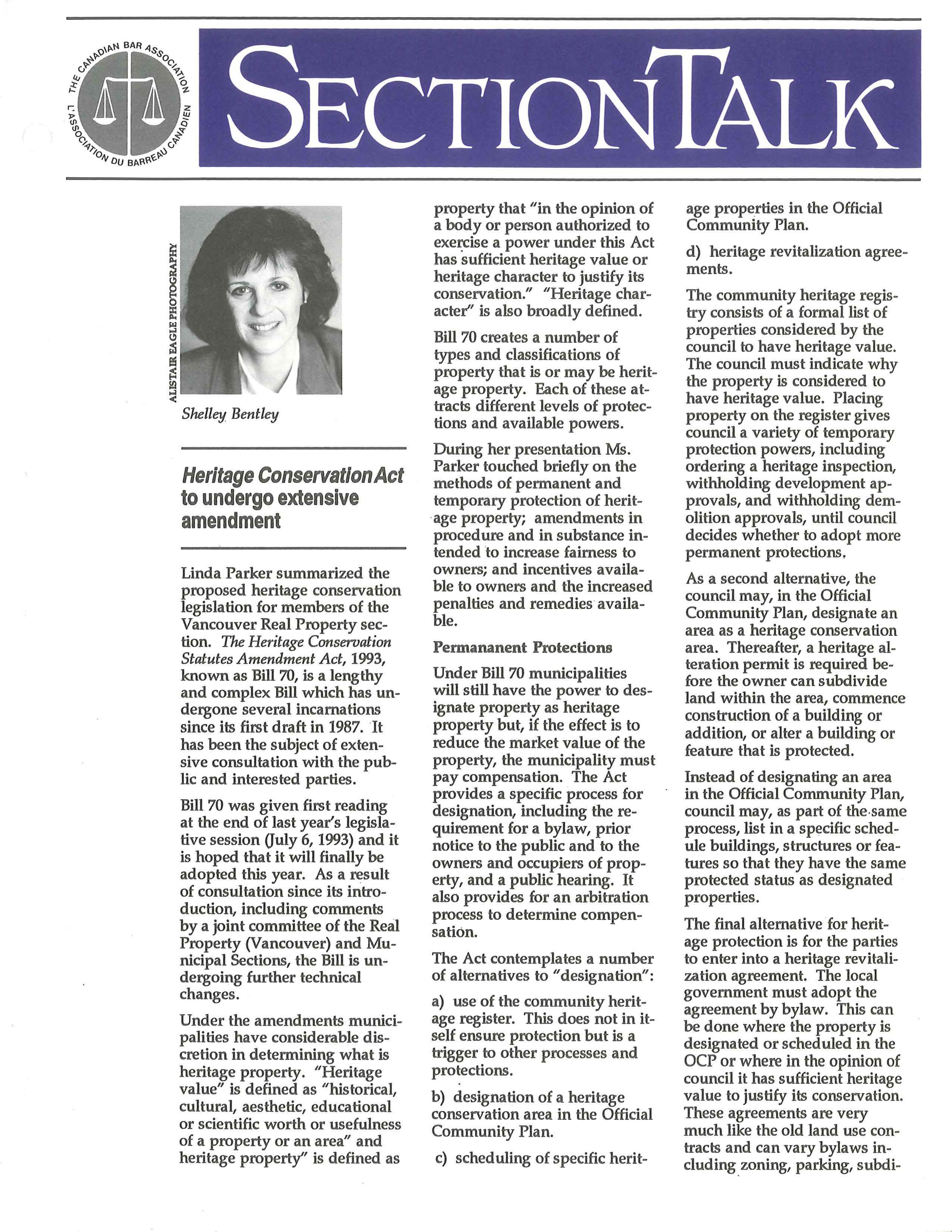 Linda Parker summarized the proposed heritage conservation legislation for members of the Vancouver Real Property section. The Heritage Conservation Statutes Amendment Act, 1993, known as Bill 70, is a lengthy and complex Bill which has undergone several incarnations since its first draft in 1987. It has been the subject of extensive consultation with the public and interested parties.