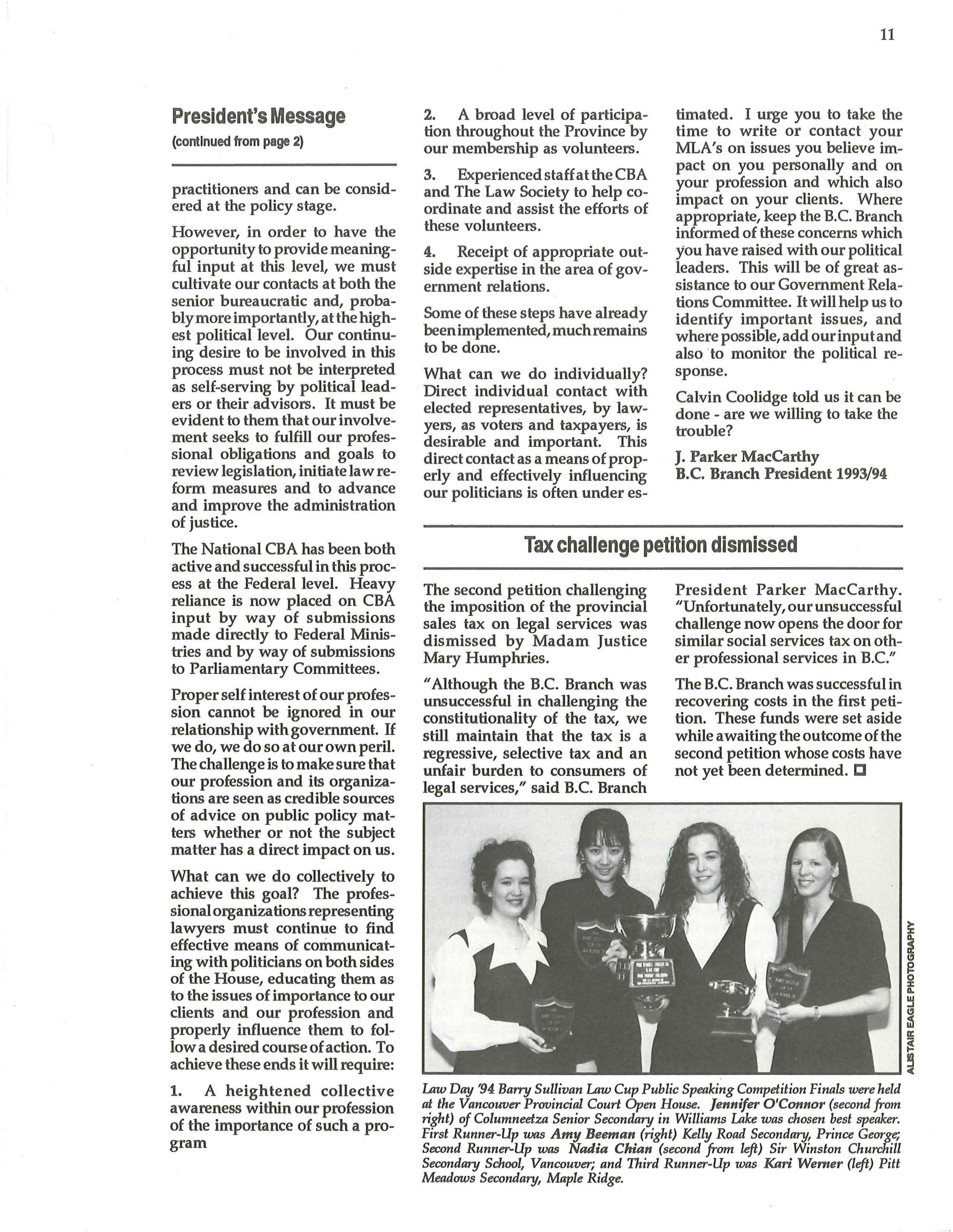 Alistair Eagle Photography (688-8867) is the CBA (B.C. Branch) official photographer. C Copyright the British Columbia Branch of the Canadian Bar Association-1994