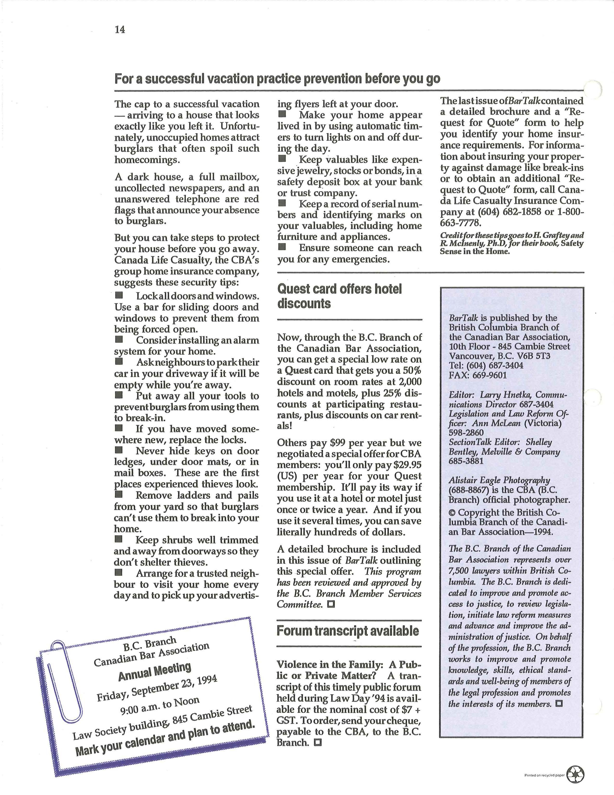 Violence in the Family: A Public or Private Matter? A transcript of this timely public forum held during Law Day '94 is available for the nominal cost of $7 + GST. Toorder, sendyourcheque, payable to the CBA, to the B.C. Branch. C