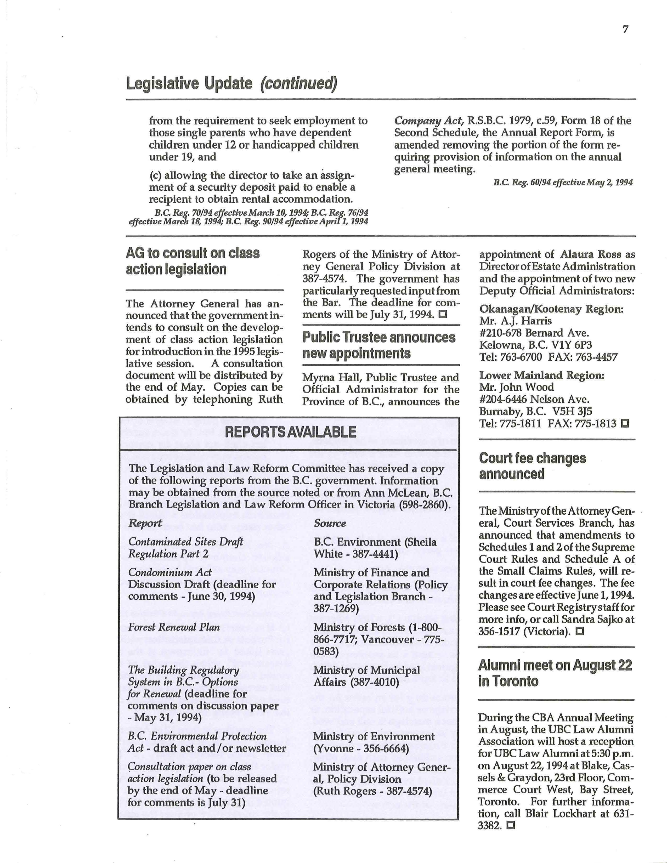 Since 1989, the B.C. Branch Legislative and Law Reform Committee, chaired initially by Bonita Thompson and subsequently Greg Steele, has established a high level of credibility for the legal profession among several Provin- . cial Government Ministries. Representatives from the CBA are often requested to provide input on legislation tabled in the legislature. Submissions are sought from our sections and their responses are coordinated by Ann McLean, the Branch Legislative and Law Reform Officer. On occasion, we are asked to review draft legislation on a confidential basis. Input at this stage can be very imp ortant in ensuring that practical concerns and the legal implications of the proposed legislation are identified by legal