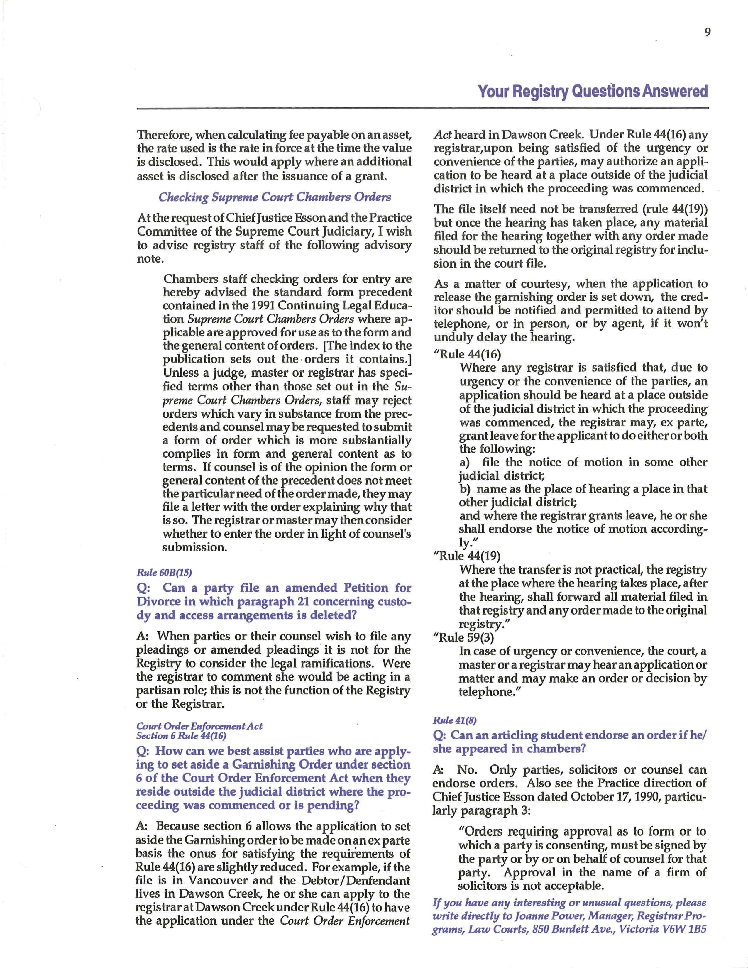 BarTalk is published by the British Columbia Branch of the Canadian Bar Association, 10th Floor - 845 Cambie Street Vancouver, B.C. V6B 5T3 Tel: (604) 687-3404 FAX: 669 -9601