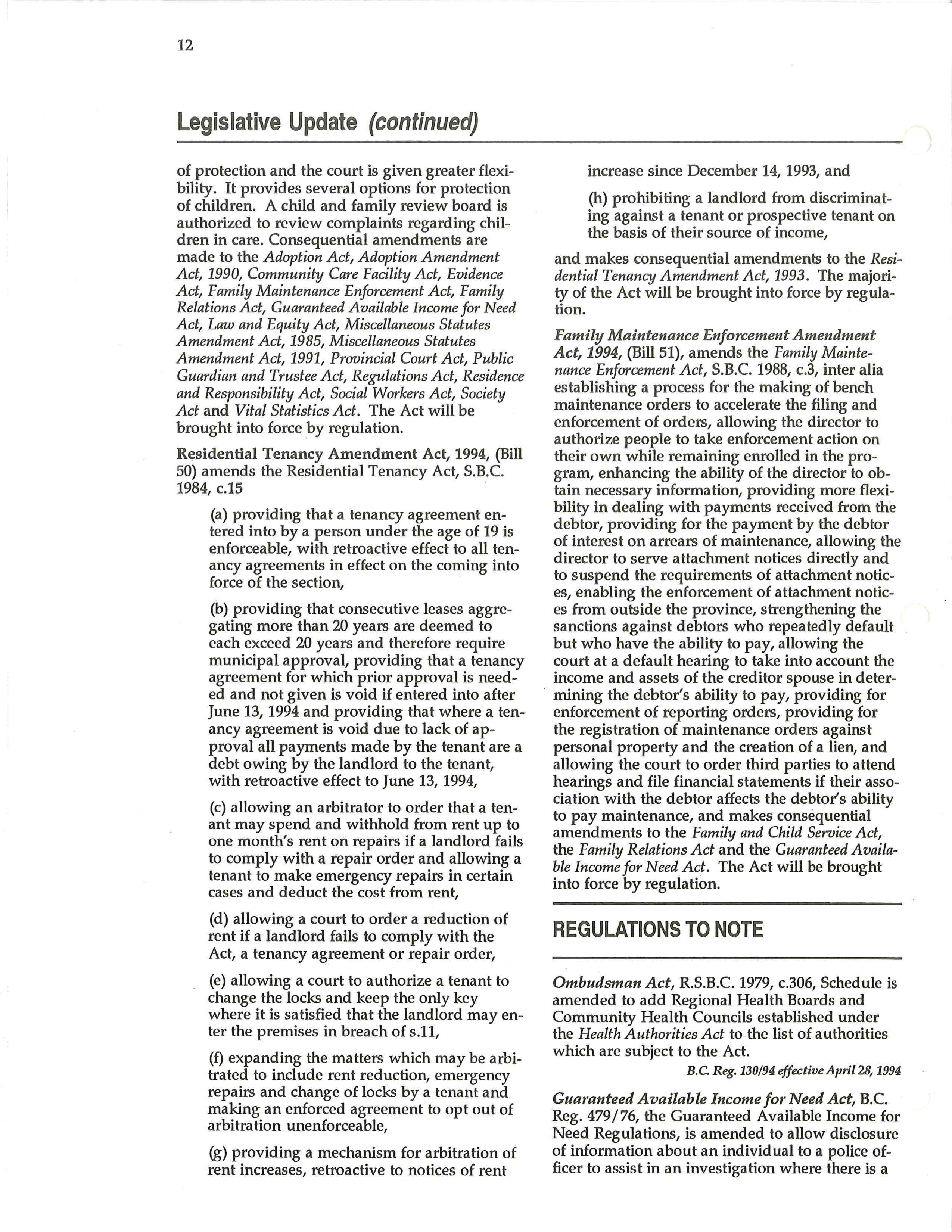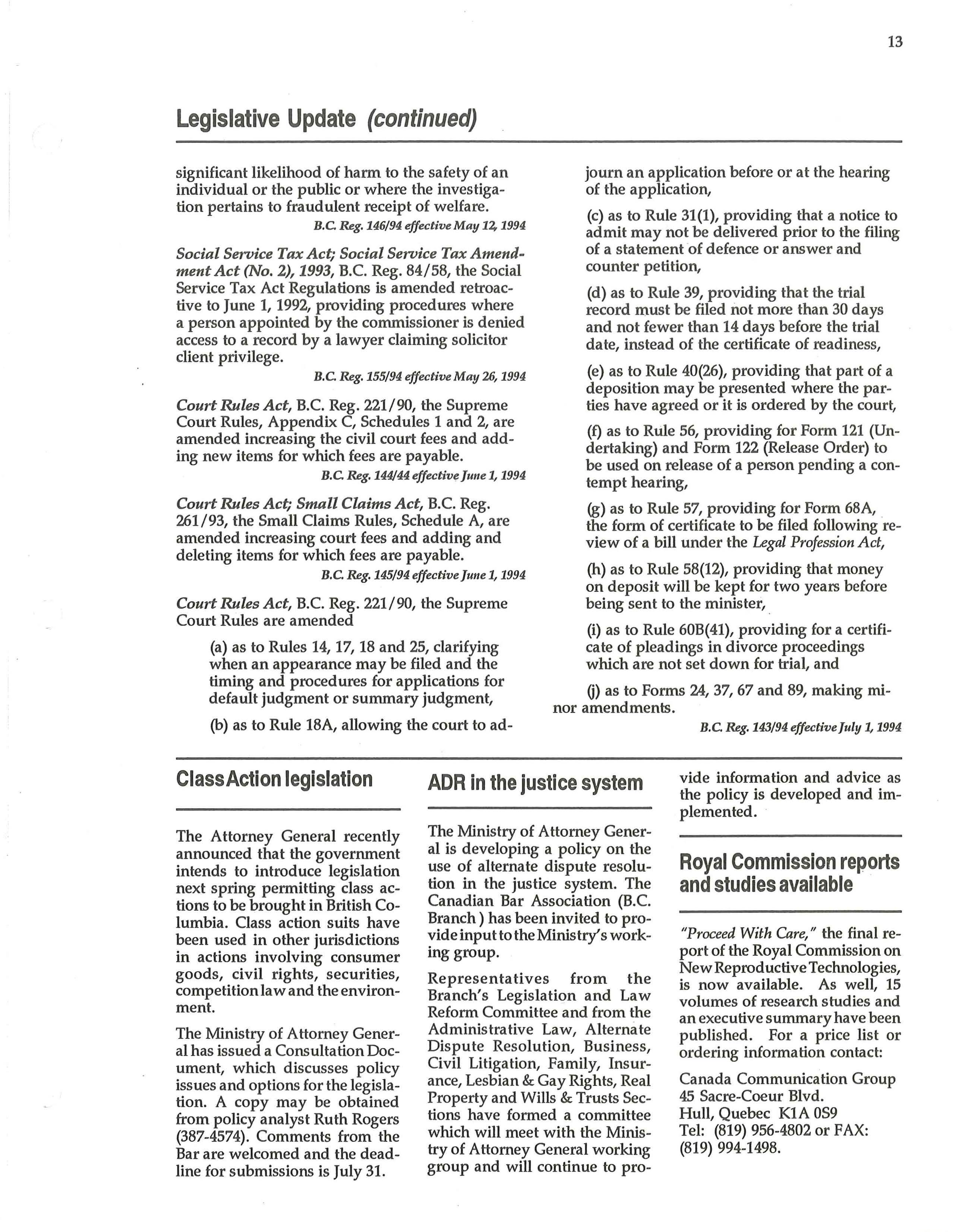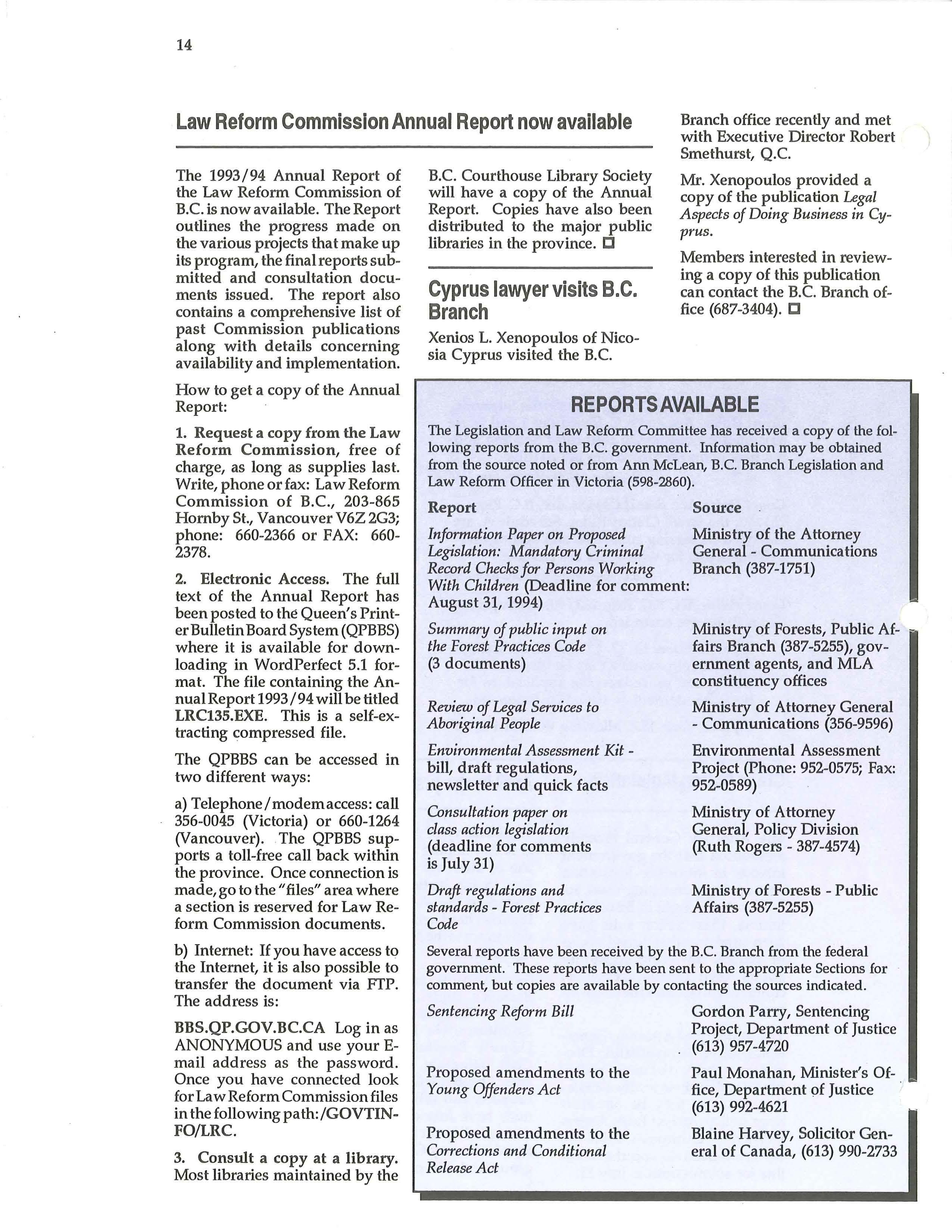 On June 18, 1994, Provincial Council debated the issue of the proposed Legal Services Society (LSS) staff delivery plan. A resolution was passed that urges LSS to defer any further implementation of the reform package respecting staff delivery until savings and service improvements throughstaffdeliverycan be demonstrated. As well, the resolution states its opposition to specific government funding tied to the provision of staff delivery of legal aid.