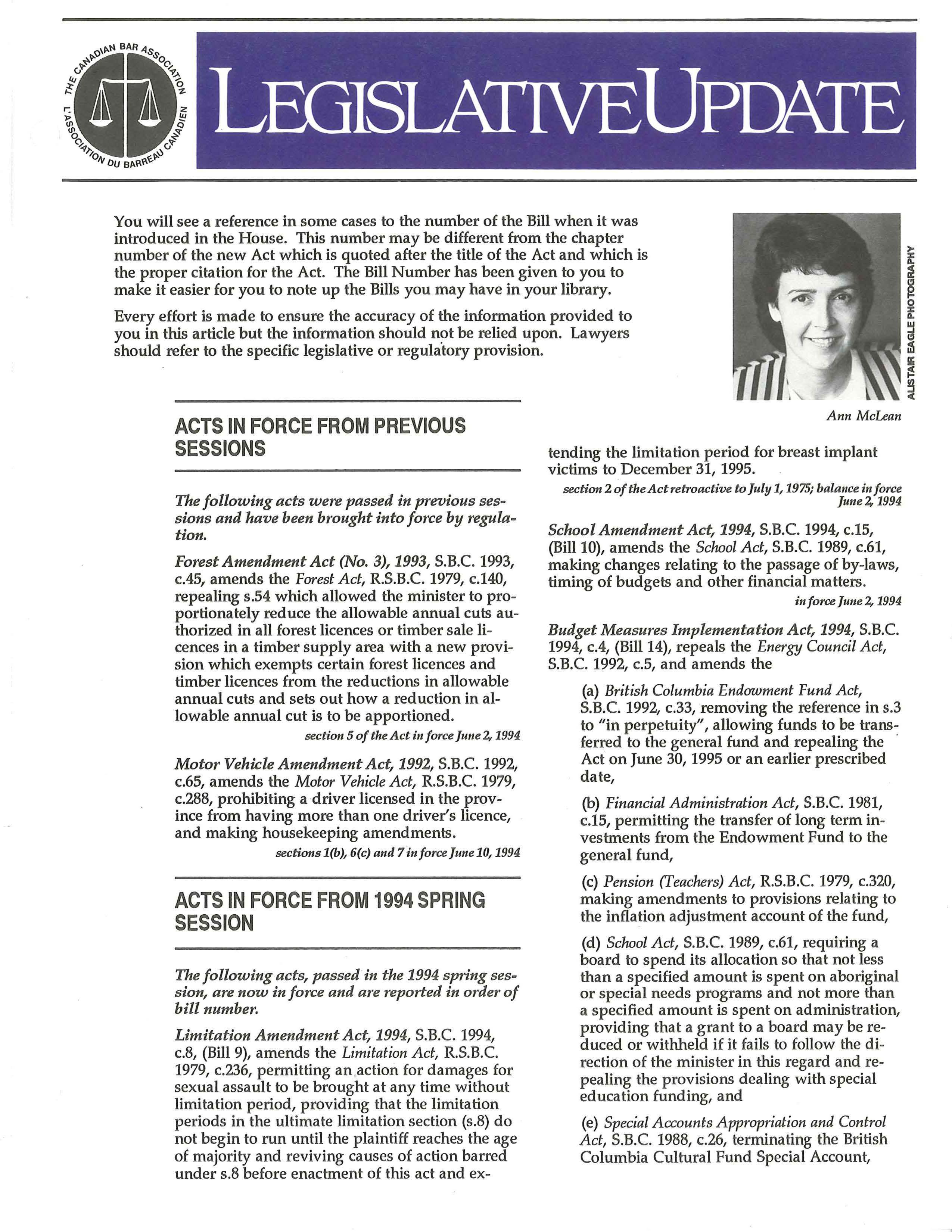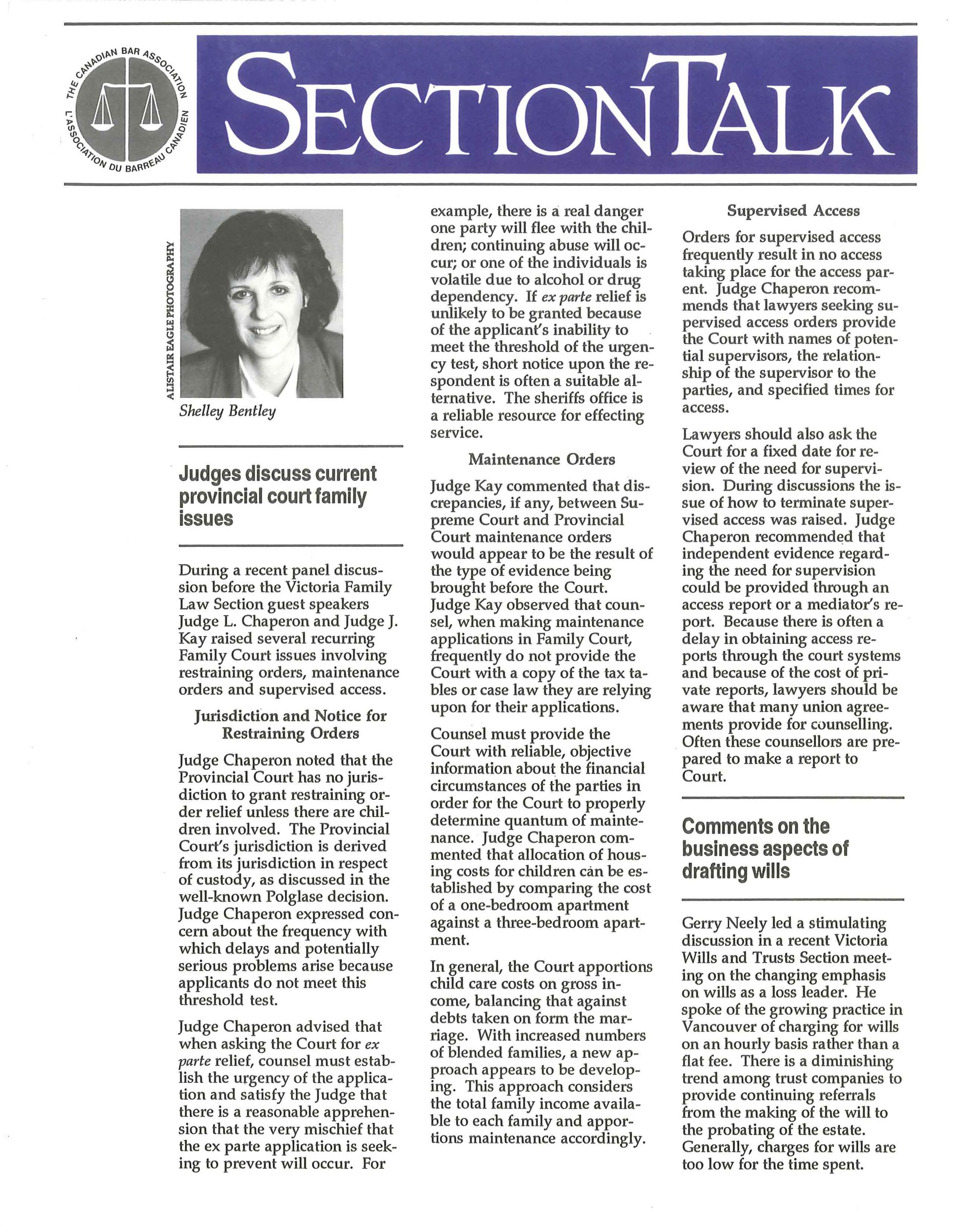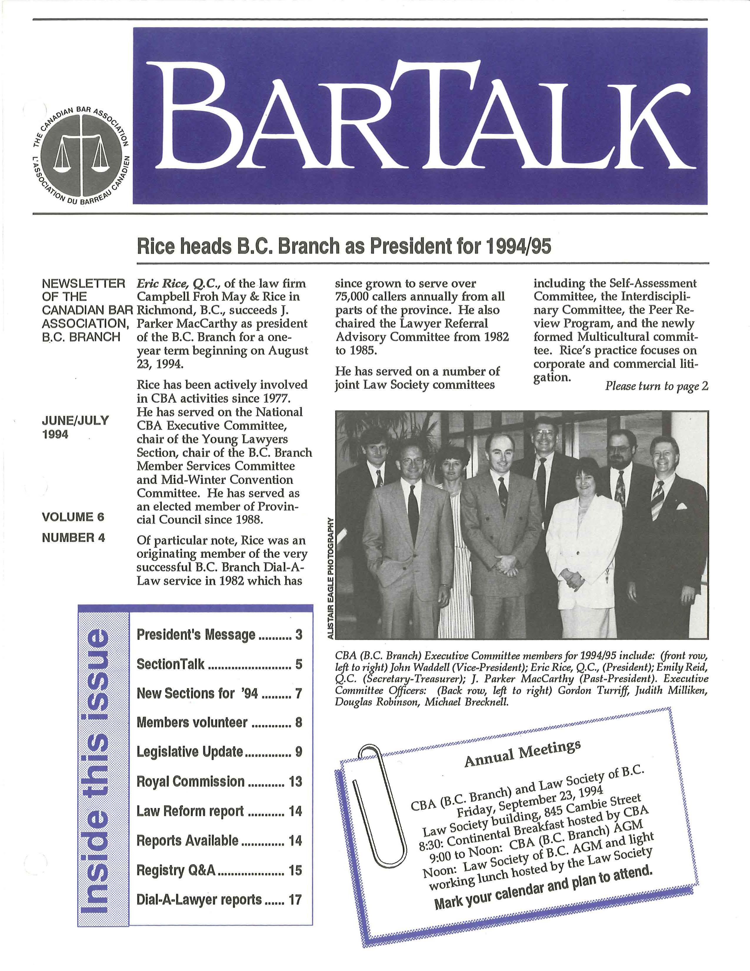 BarTalk is published by the British Columbia Branch of the Canadian Bar Association, lOth Floor - 845 Cambie Street Vancouver, B.C. V6B 5T3 Tel: (604) 687-3404 FAX: 669-9601