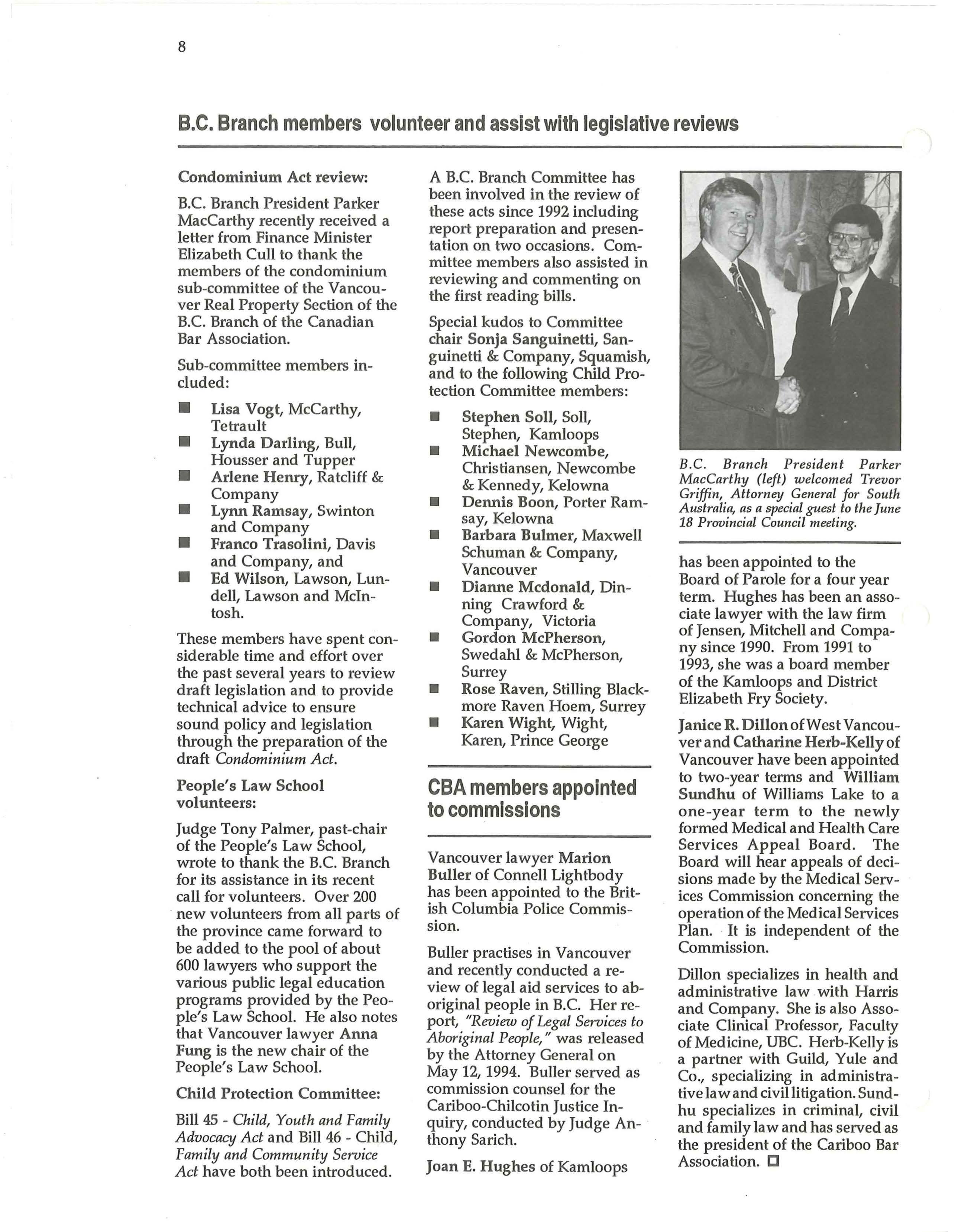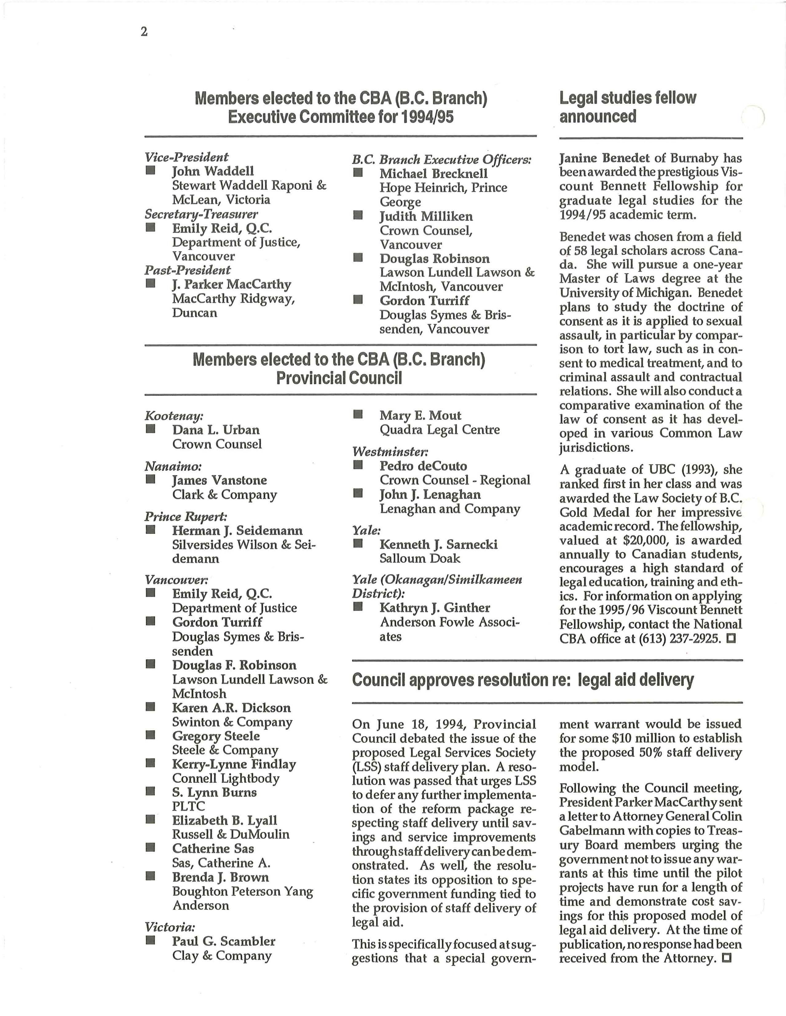 Members elected to the CBA (B.C. Branch) Executive Committee for 1994/95
