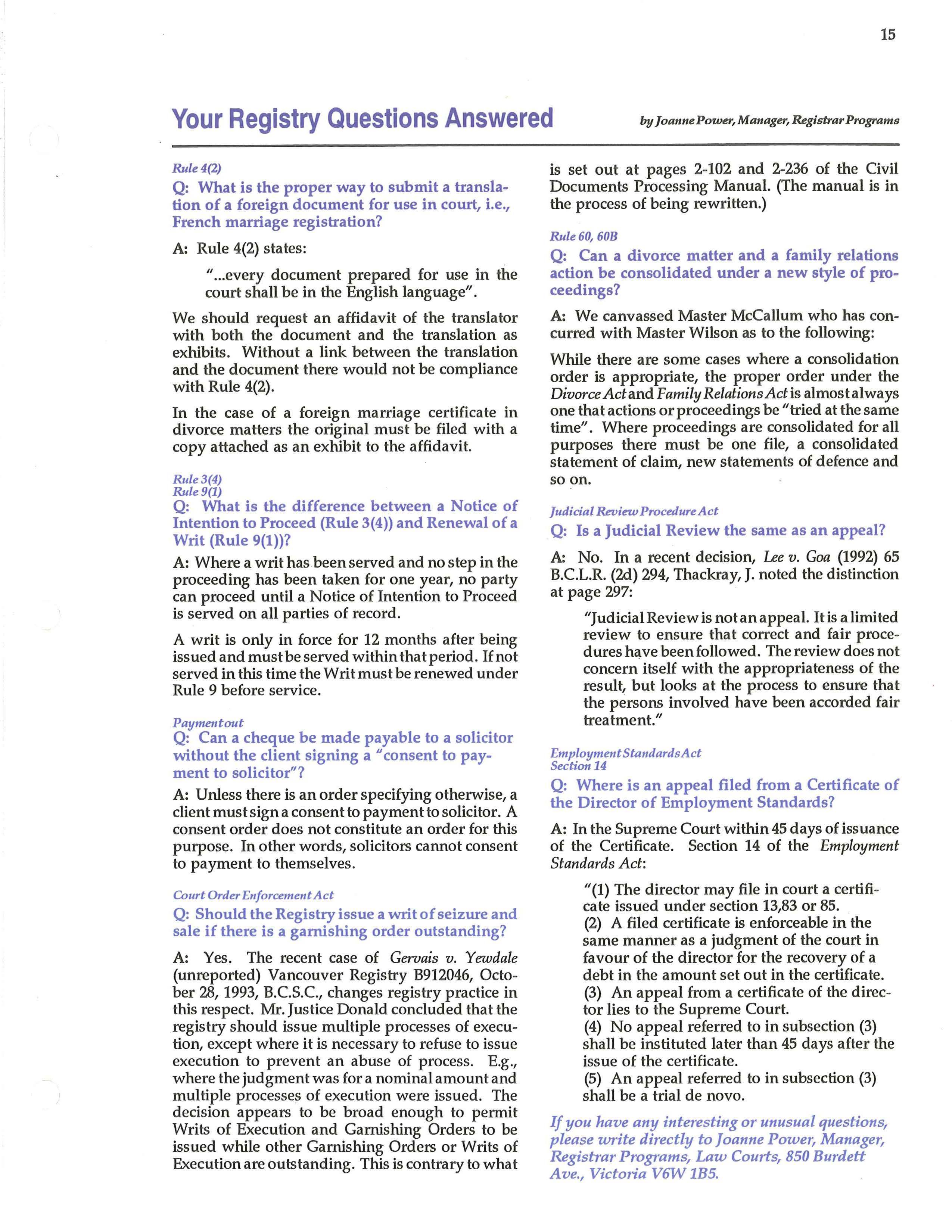 If you have any interesting or unusual questions, please write directly to Joanne Power, Manager, Registrar Programs, Law Courts, 850 Burdett Ave., Vict01ia V6W 1B5.
