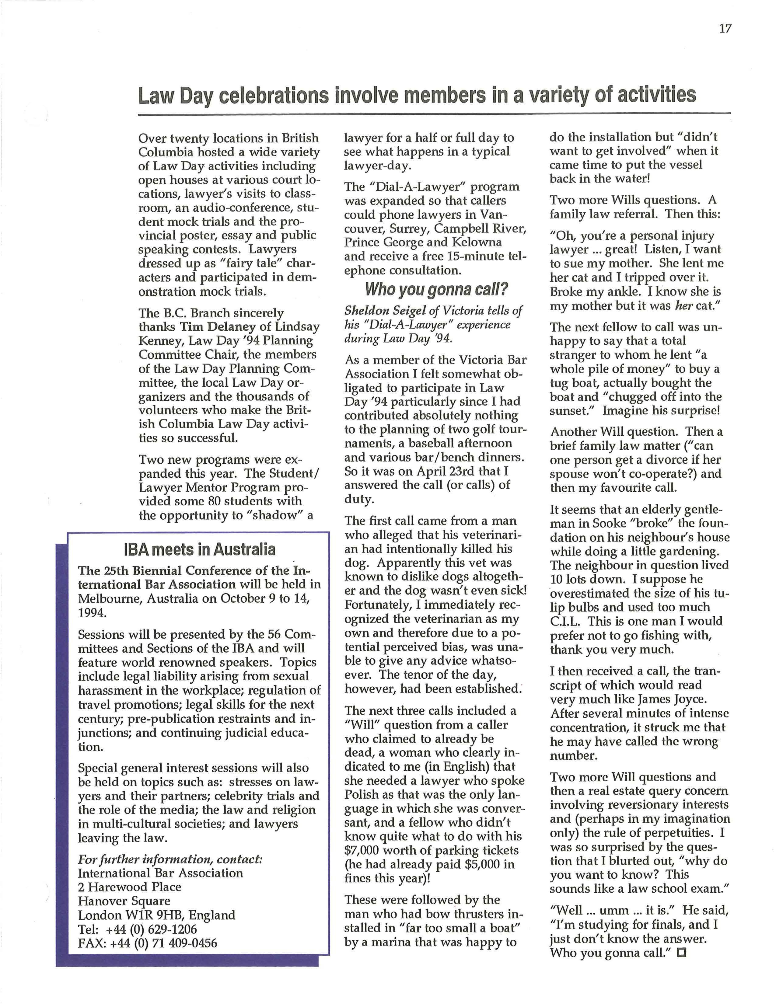 Sh e ldon Seigel of Victoria tells of his "Dial -A -Lawyer" experience during Law Day '94.