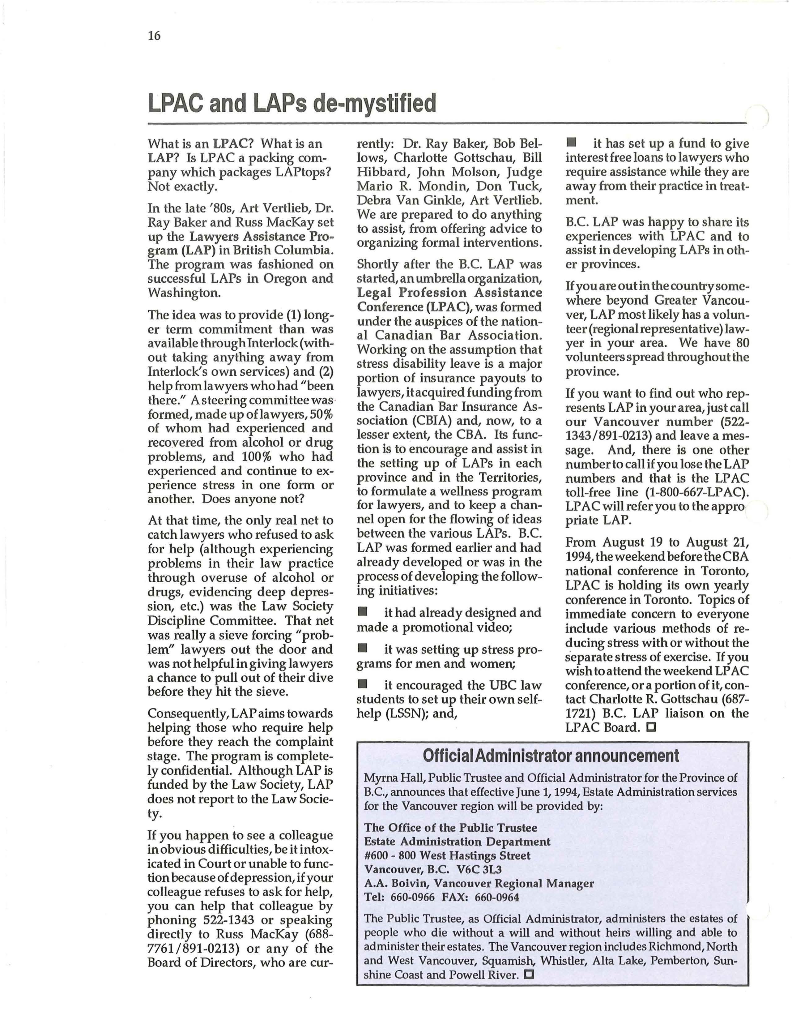 From August 19 to August 21, 1994, the weekend before the CBA national conference in Toronto, LPAC is holding its own yearly conference in Toronto. Topics of immediate concern to everyone include various methods of reducing stress with or without the separate stress of exercise. If you wishtoattend the weekend LPAC conference, or a portion of it, contact Charlotte R. Gottschau (6871721) B.C. LAP liaison on the LP AC Board. C