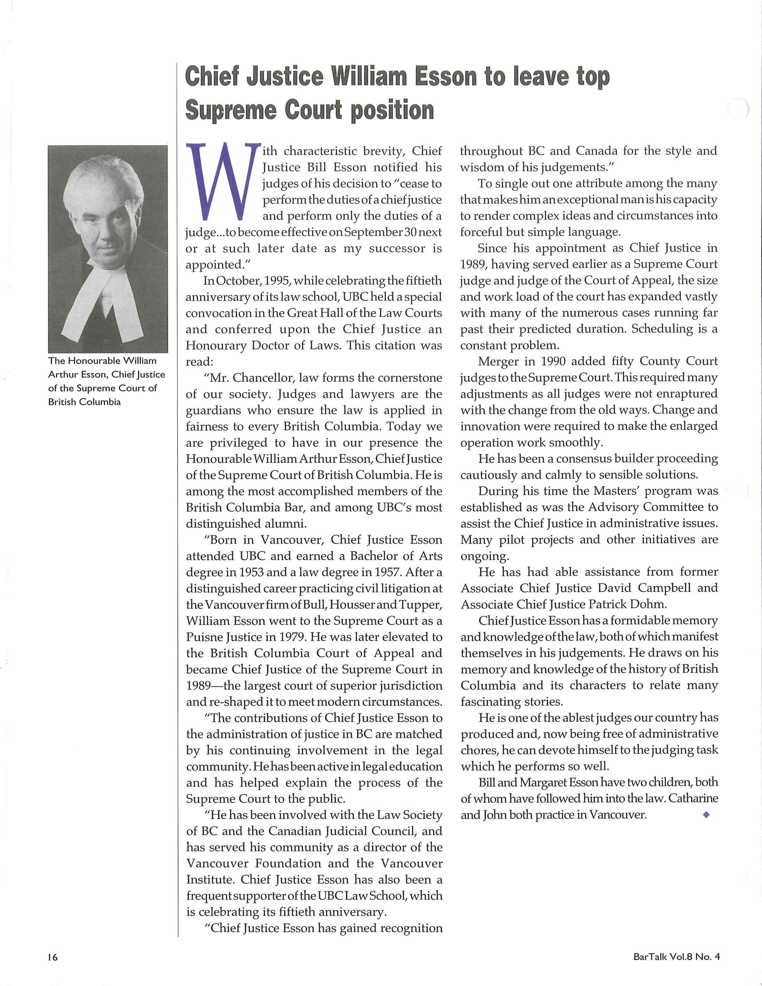 The role of the Pres ident of the BC Branch of the CBA is an important one. Remarkably, it is a position more respected by people outside the profession than within. For all our hand-w ringing over our image oflawye rs, it i s comforting to know that our As s ociation retains a prominent, and valued, pos ition in th e ey es of the public. That realization, and the many s ati sfying experiences I have had as President, leave me proud to be a lawyer, and a member of the CBA. •