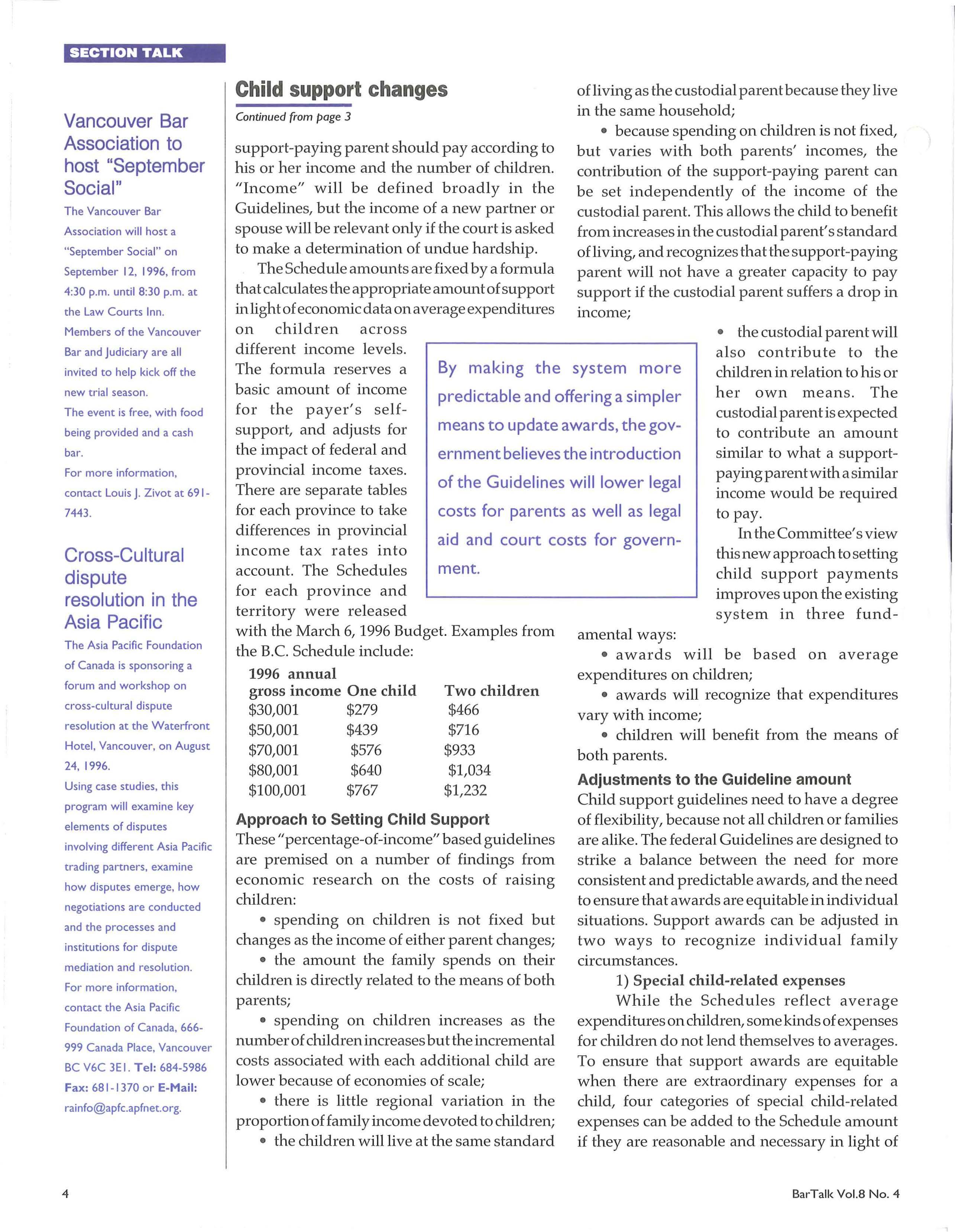 In the Committee's view this new approach to setting child support payments improves upon the existing system in three fundment. territory were released with the March 6, 1996 Budget. Examples from the B.C. Schedule include: