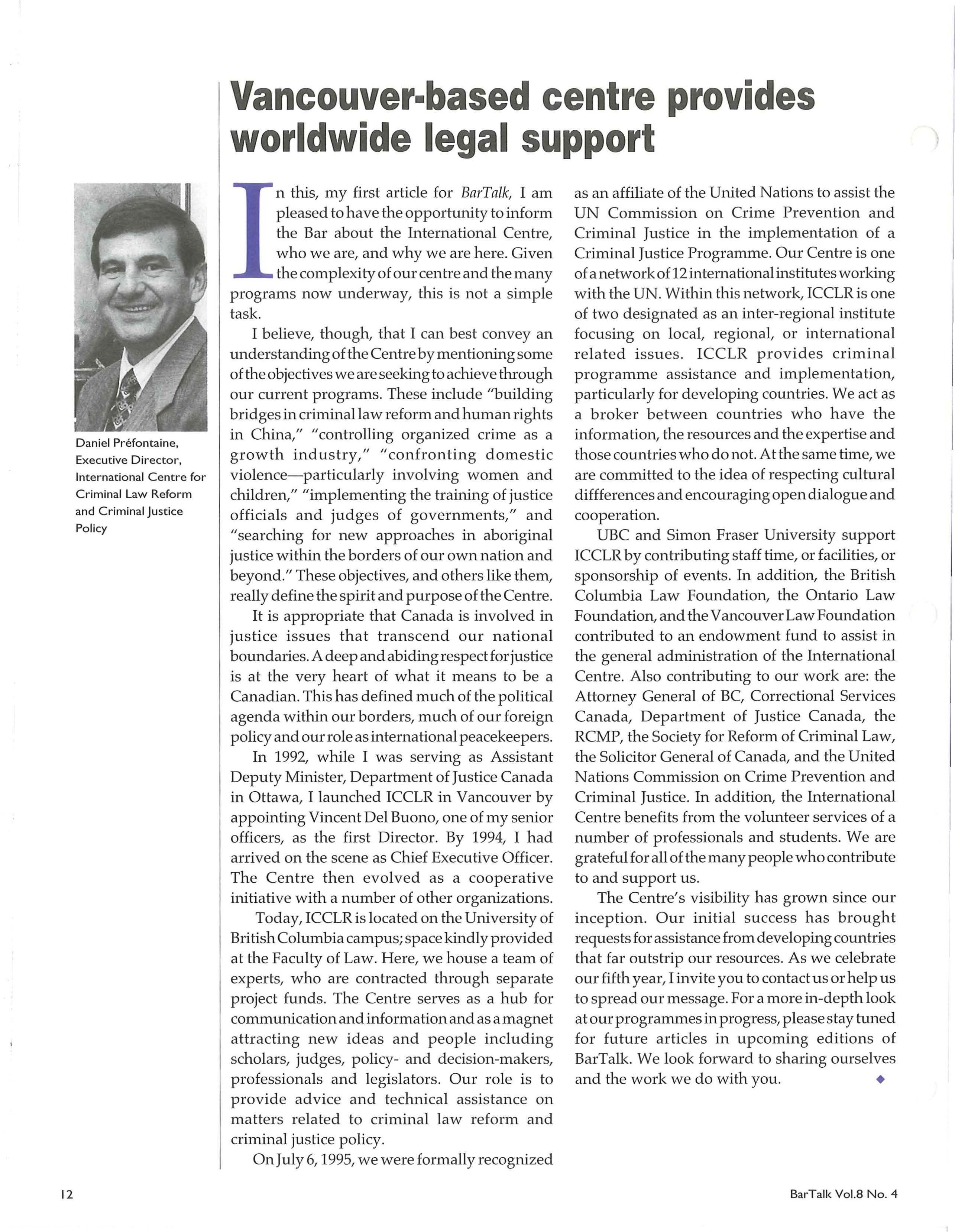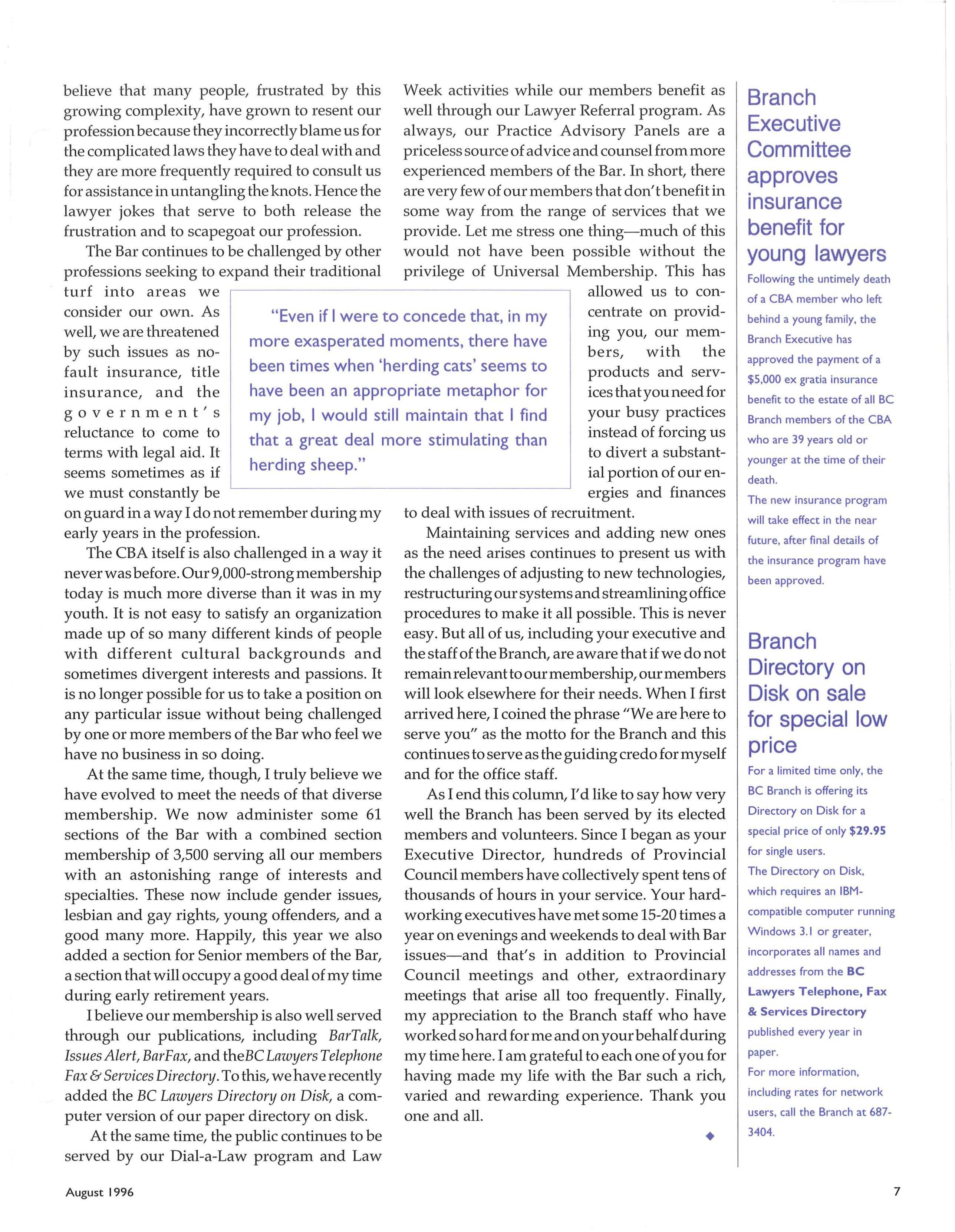 I speak of governm e nt employees and employees of independent s ocieties, of which I am one. It has often been my impression that we have been largel y overlooked by the CBA, BC Branch We do not earn the large dollars, nor do we have the high profiles of many of the large firms to which you referred in your message. We have rarely, if ever, been asked for our opinion with respect to the focus of the BC Branch and its se rvice priorities In fact, when the CBA deals with a s ociety s uch as the Legal Services Society, where I am employed, it deals largely with the Board of Directors who, while well versed in the needs of its staff lawyers, has as its primary objective the cost-effective delivery of legal services in the province of Briti s h Columbia.