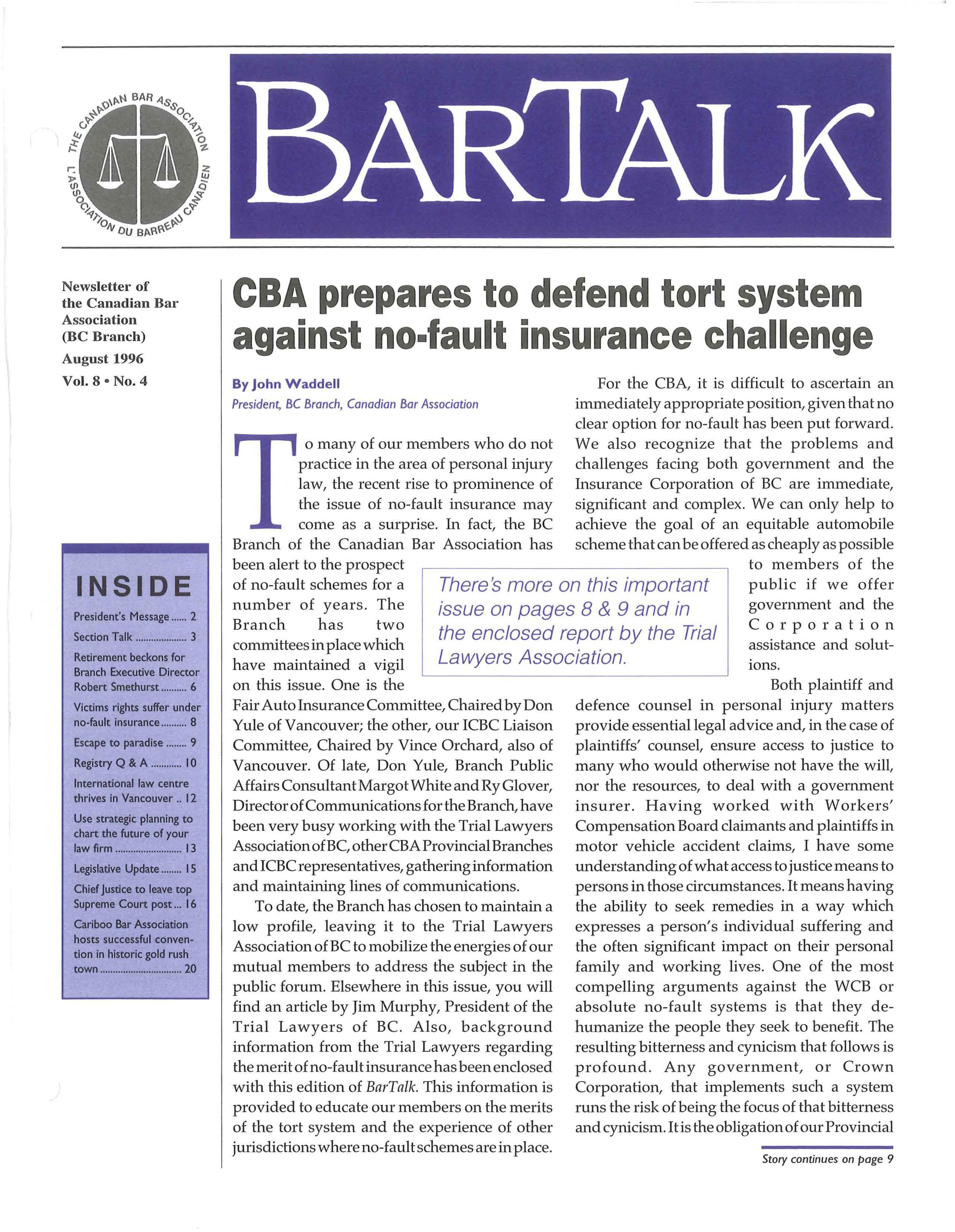 o many of our members who do not practice in the area of personal injury law, the recent rise to prominence of the issue of no-fault insurance may come as a surprise. In fact, the BC Branch of the Canadian Bar Association has
