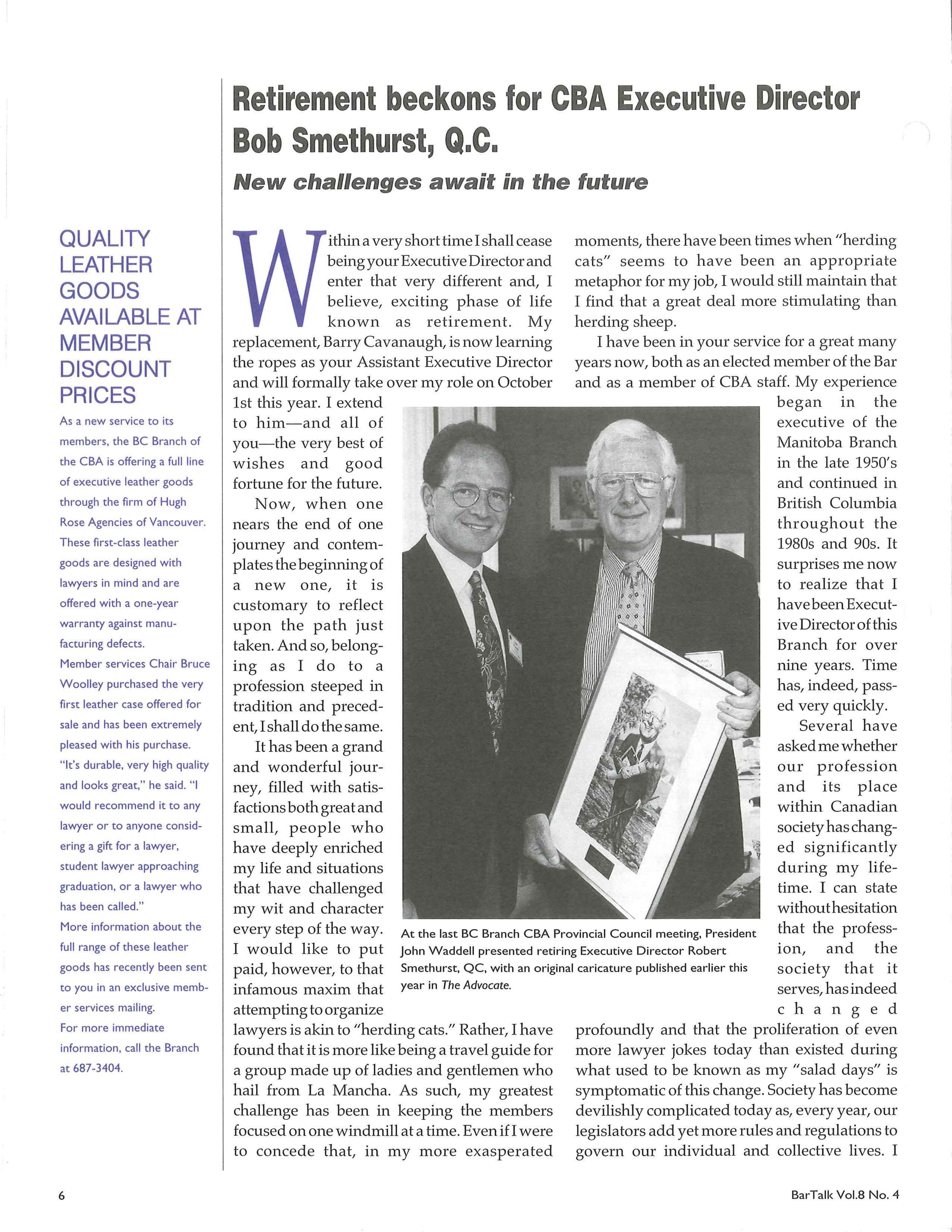 As importantly, my year a s President allowed me to work closely with Robert Smethurst, Q .C. , our retiring Branch Executive Director. Many of you will have read Parker MacCarthy's tribute to Bob in a recent edition of Th e Advocate If you haven't, please do so. For me, it was a unique opportunity to further a friendship with a man 24 years my senior whom I consider a role model and a mentor It is a rare experience to know an individual of Bob's professional stature and experience who unfailingly exhibits humility and practices the lost art of being a gentleman. There is much to learn from Bob's career as a lawyer and even more to gain from his example as a human being. He leaves his post with abilities and virtues intact and the enduring respect and affection of the organized Bar assured. We should all be so fortunate.