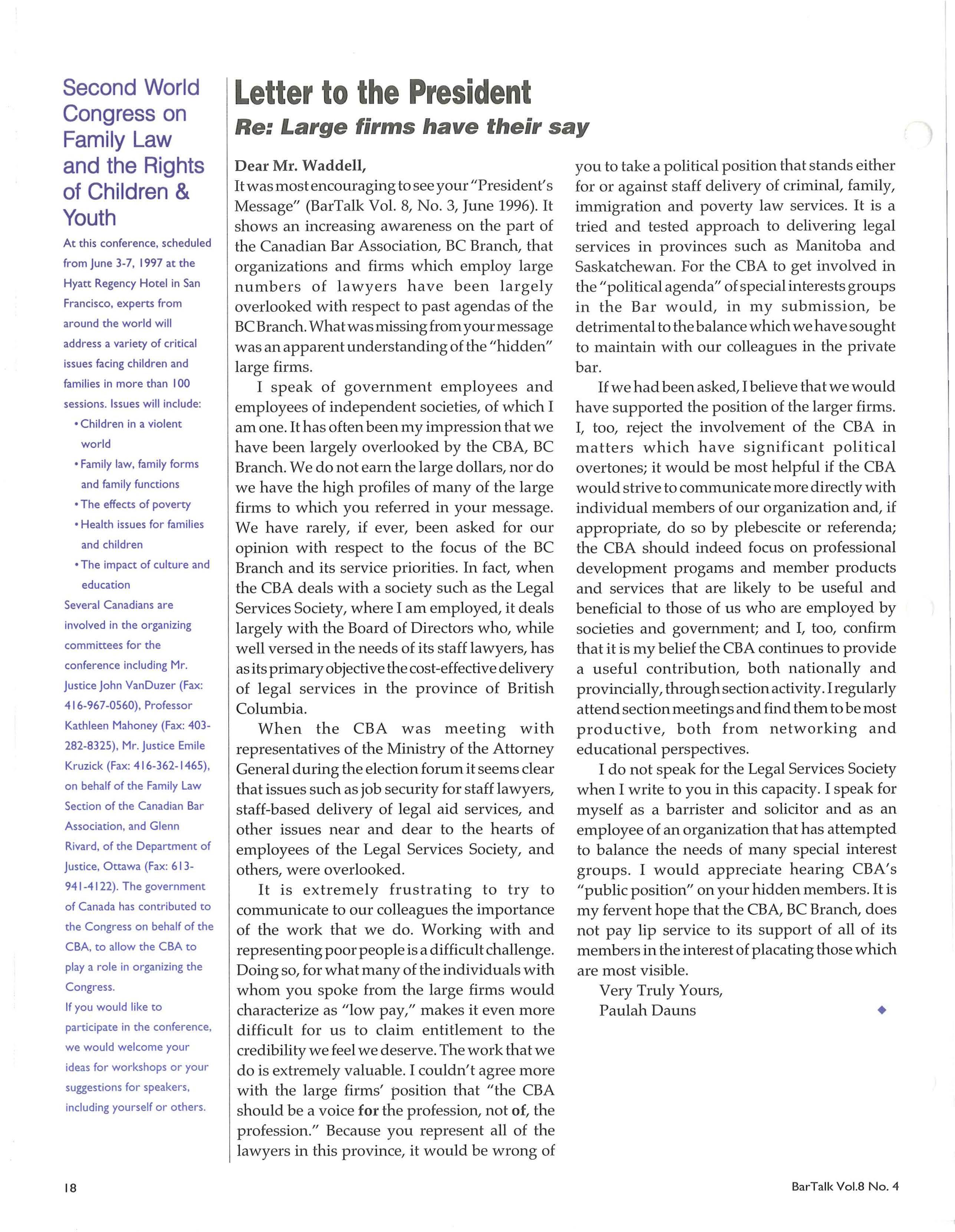It was most encouraging to see your "President's Message" (BarTalk Vol. 8, No. 3, June 1996) It shows an increa sing awareness on the part of the Canadian Bar Association, BC Branch, that or g anizations and firm s which employ lar g e numbers of lawyers have been largely overlooked with r e spect to past agend as of th e BC Branch What wa s missing from your message wa s an apparent understanding of the "hidde n " large firm s